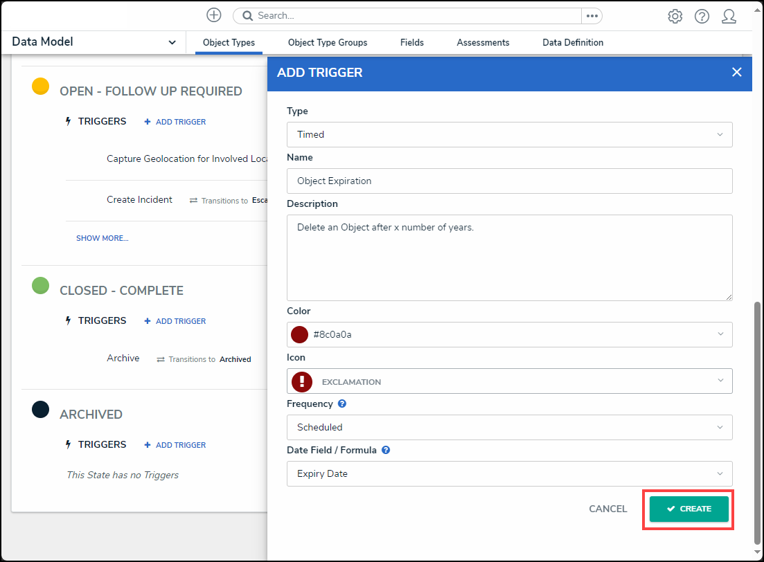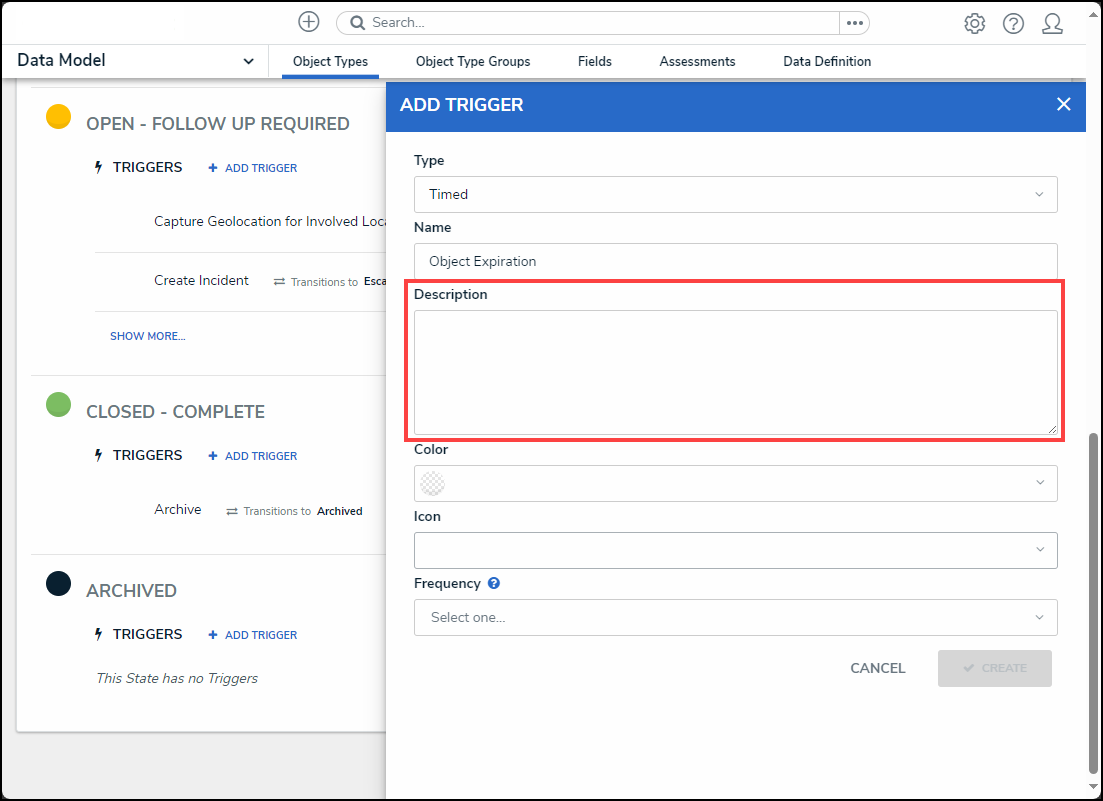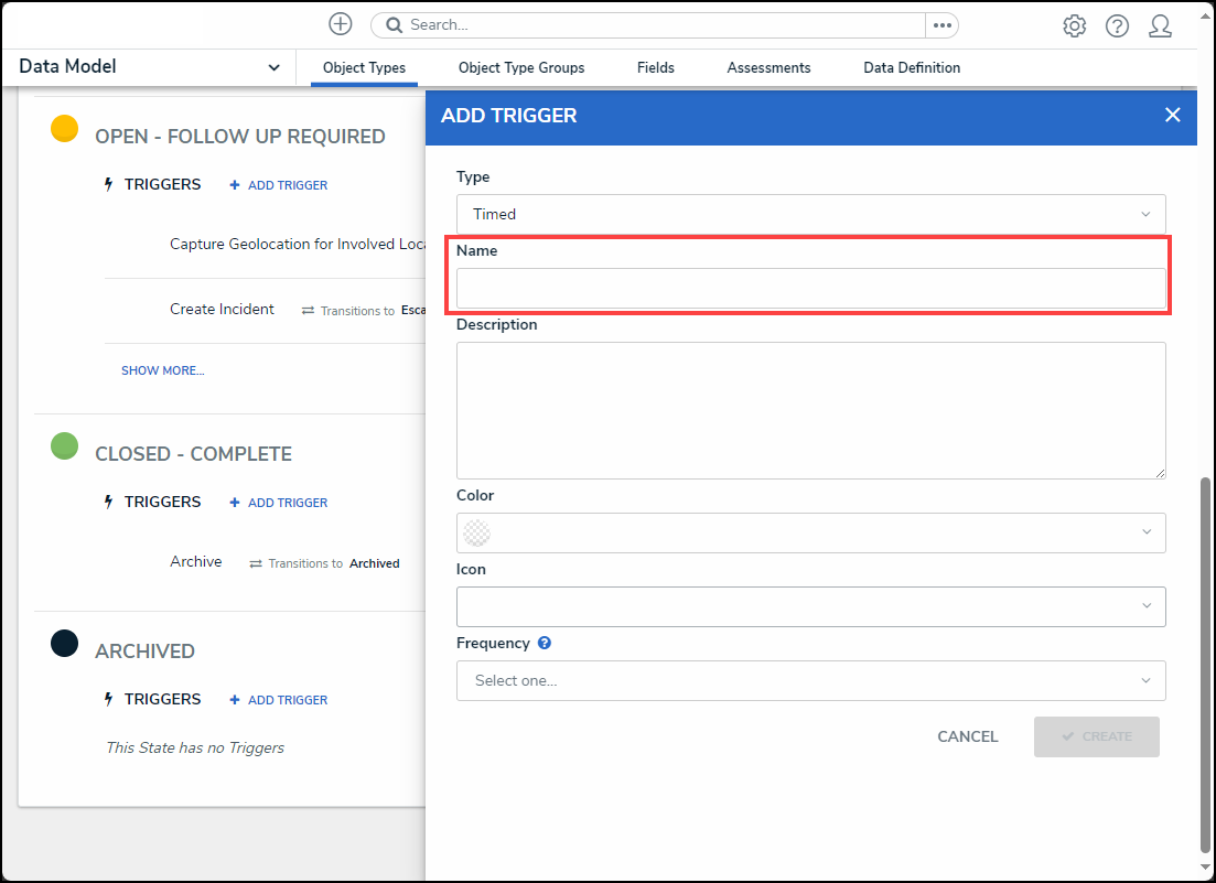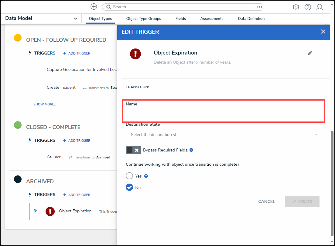 - Enter a trigger name in the Name field. The Name will appear under the selected workflow state and outlines the trigger's function (e.g., Object Expiration).