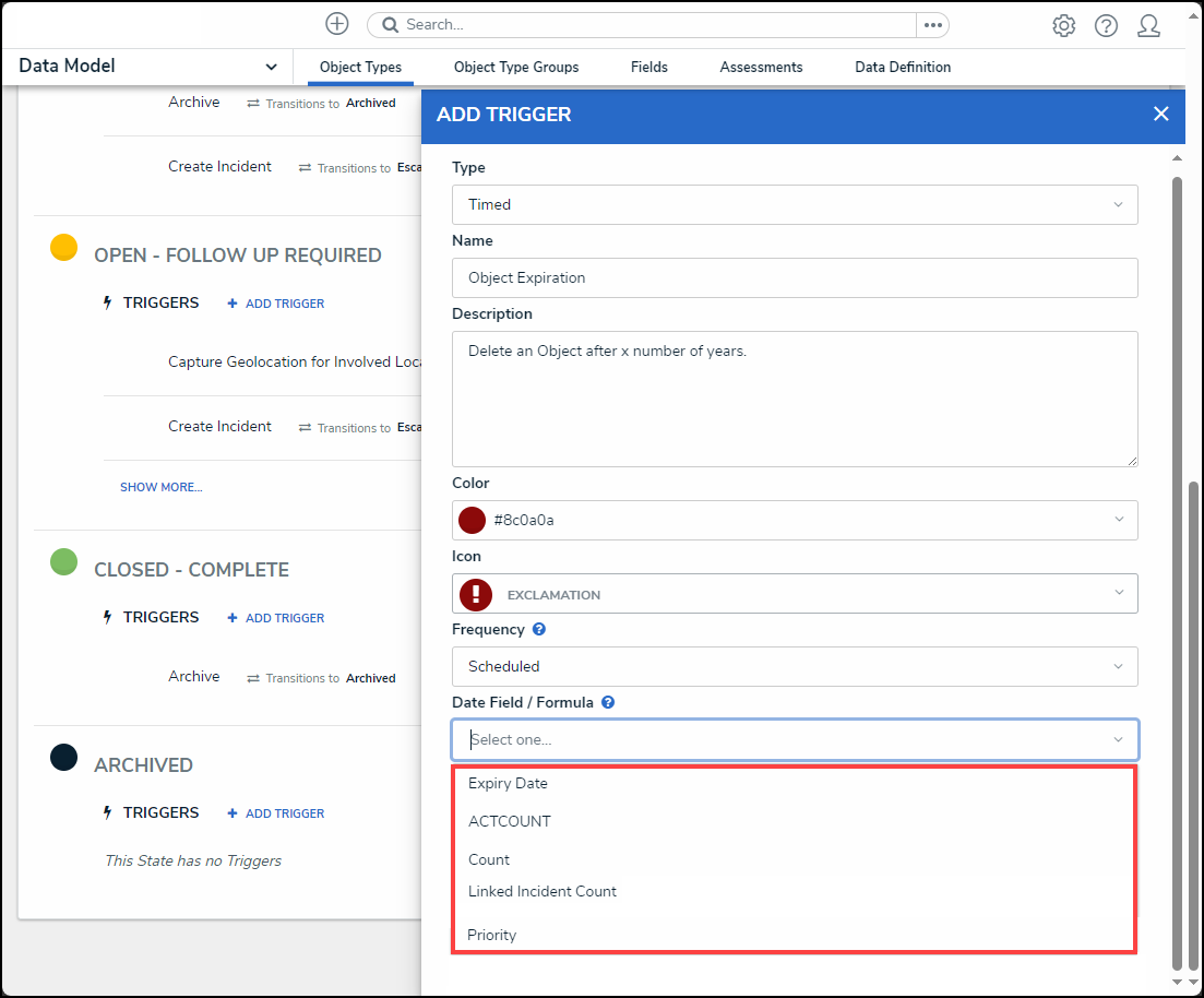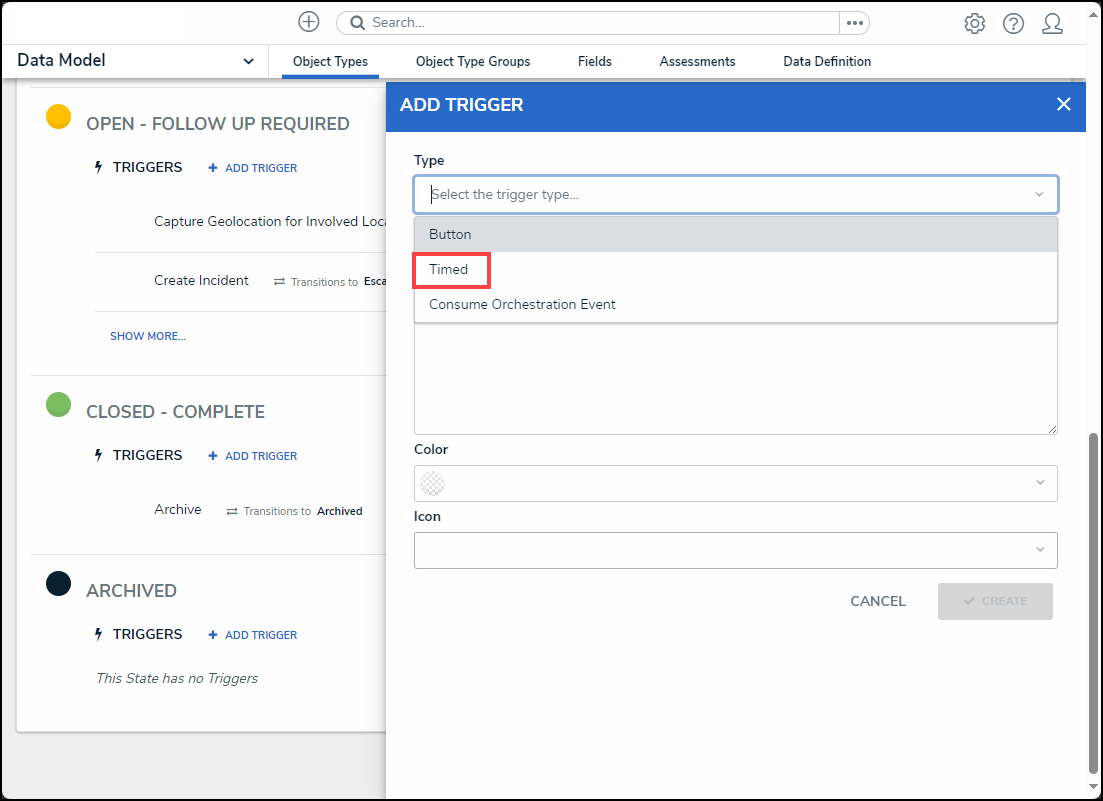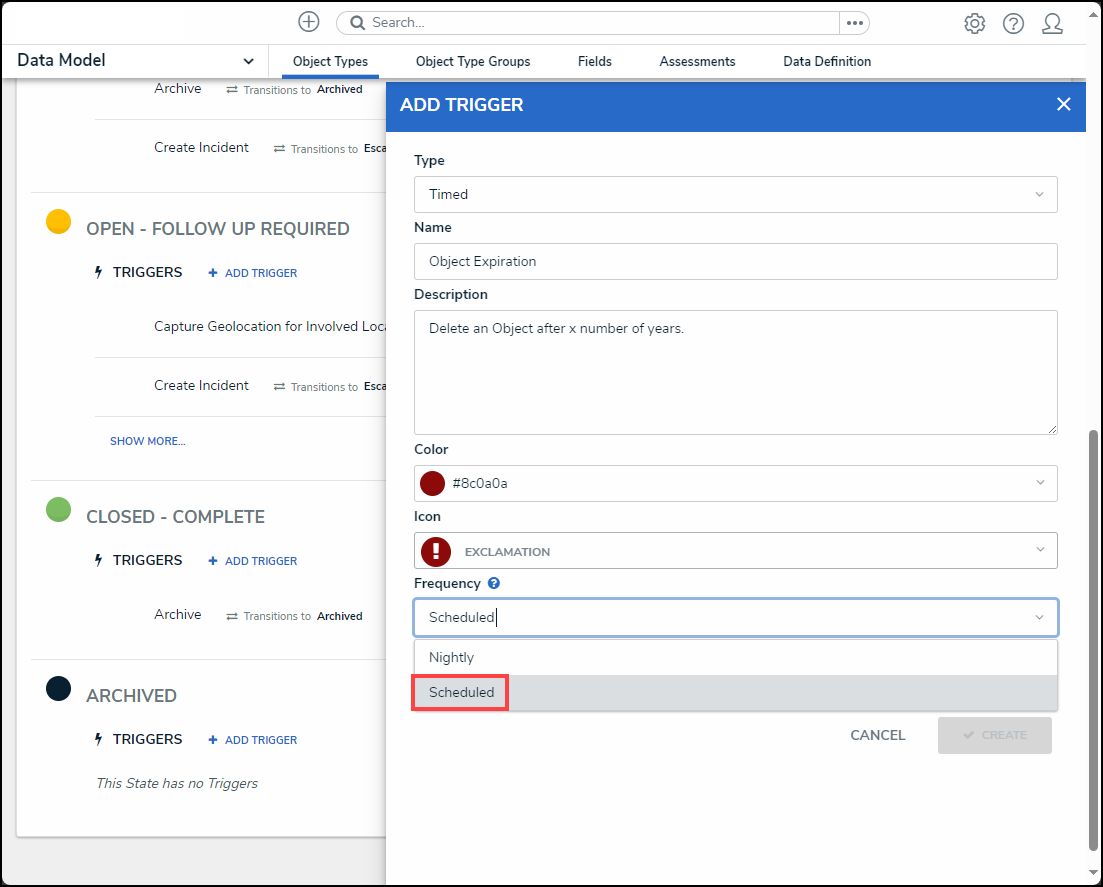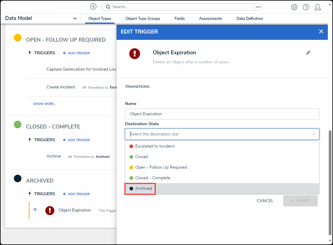 - Enter a trigger name in the Name field. The Name will appear under the selected workflow state and outlines the trigger's function (e.g., Object Expiration).