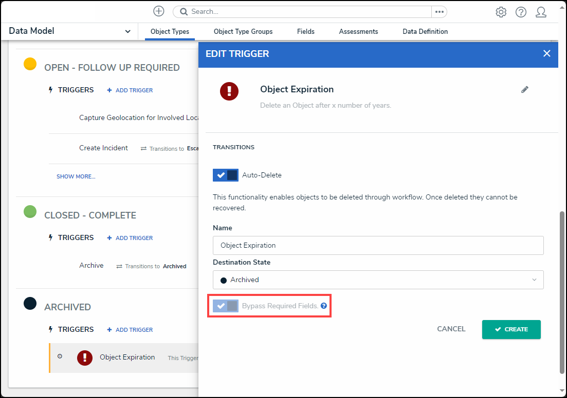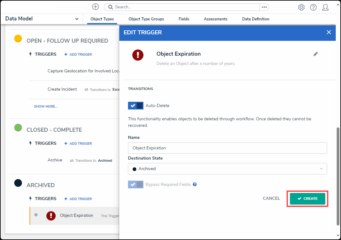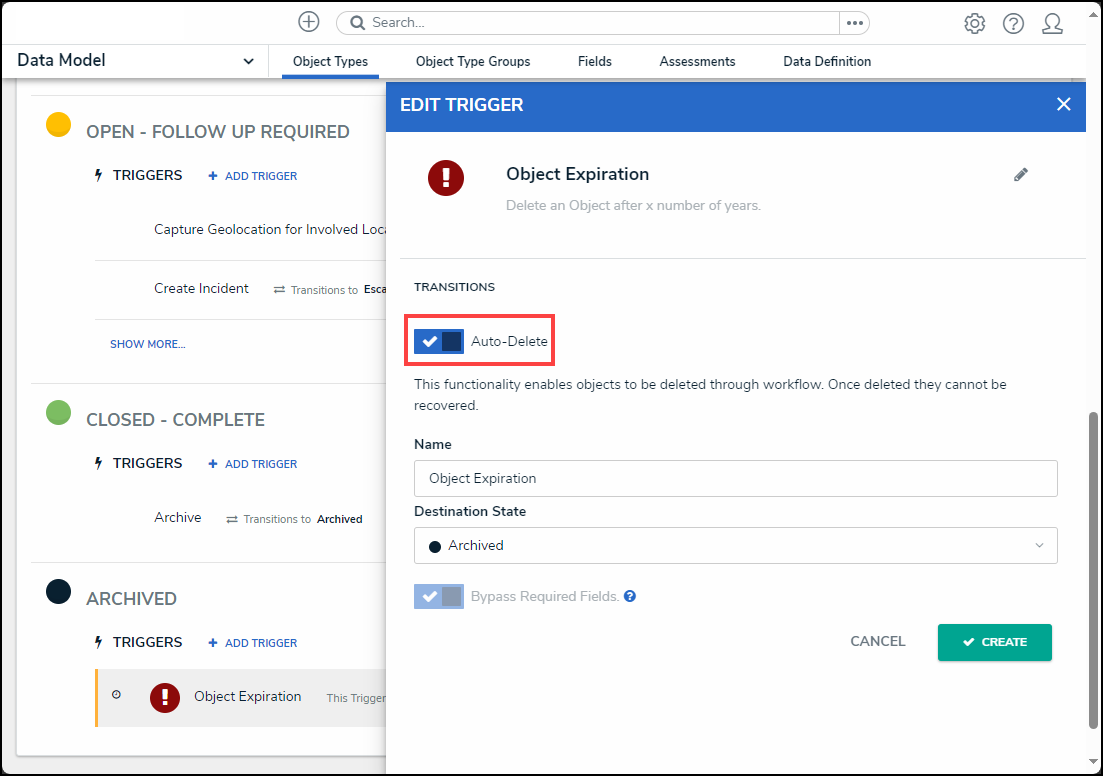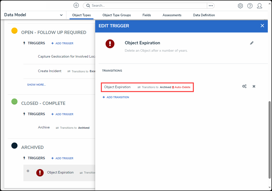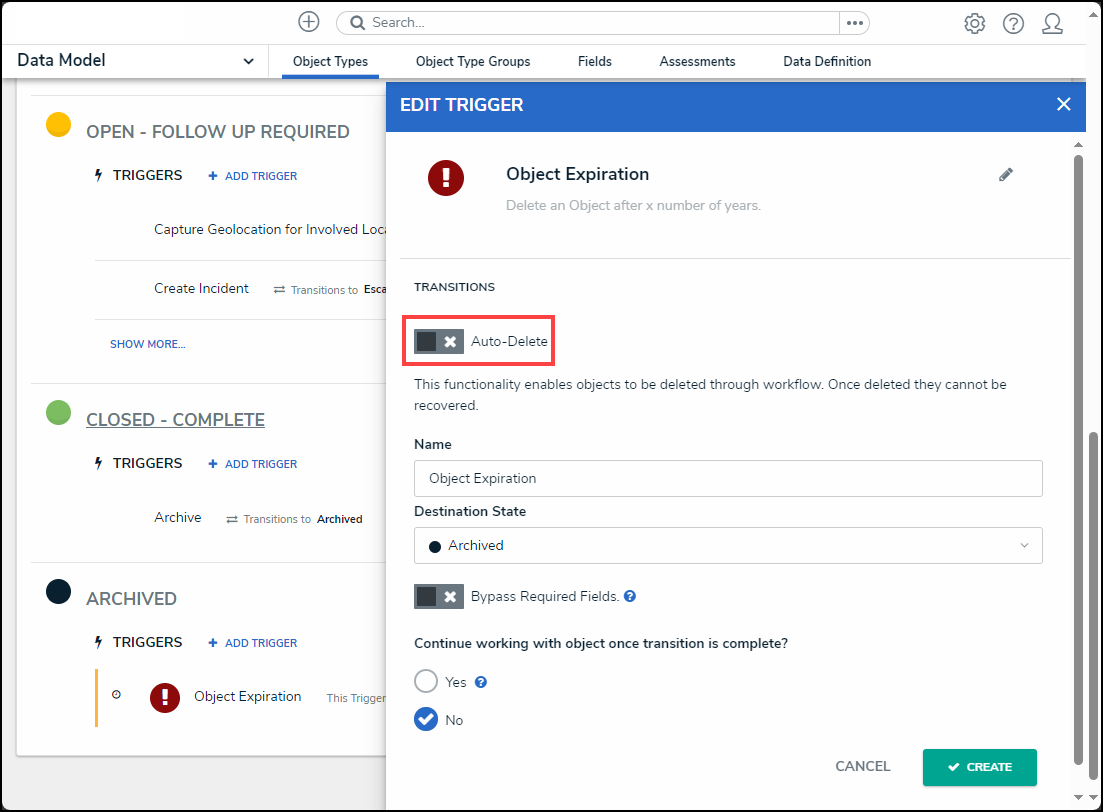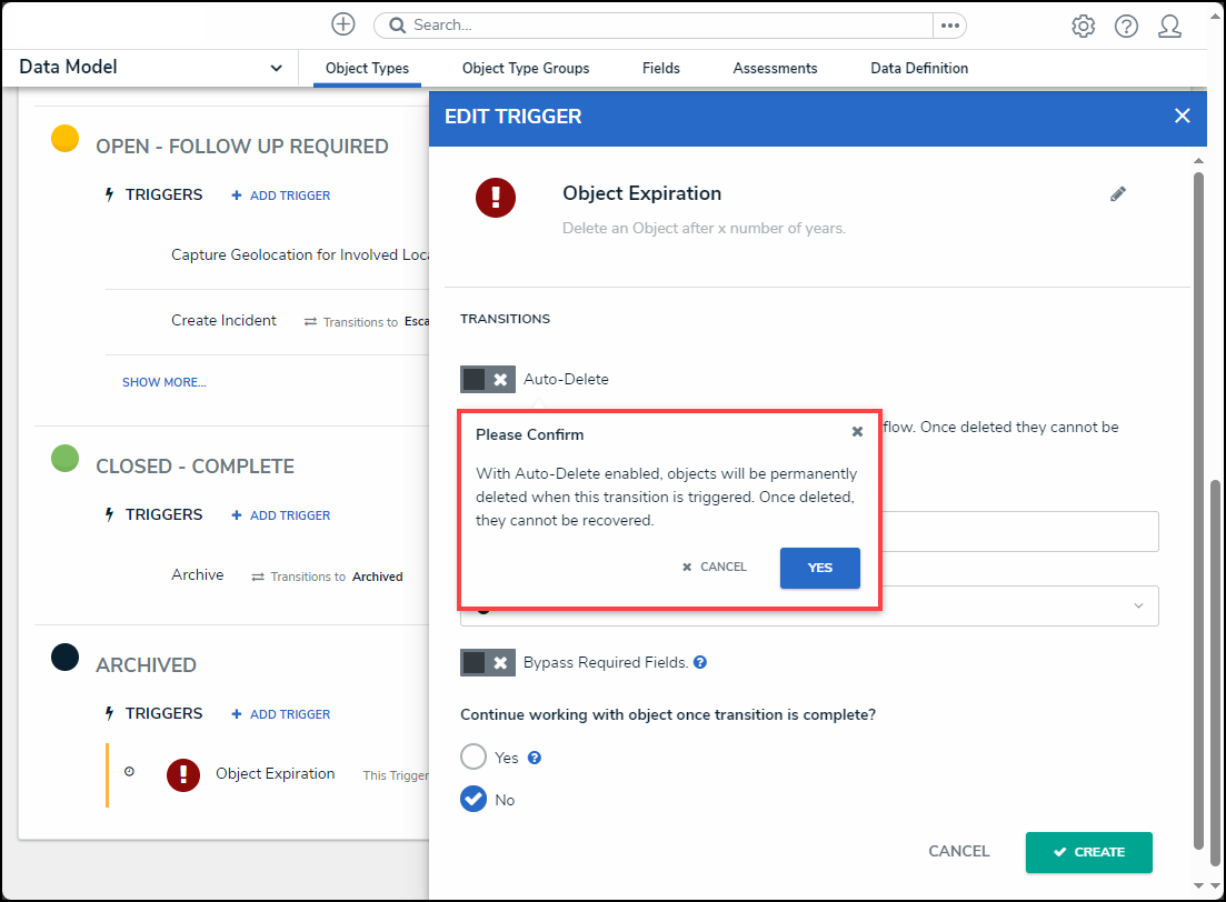 Warning: When an object is deleted, it no longer exists and cannot be reverted. Specific object data can be retained for analytical purposes and must be setup on the object type. |