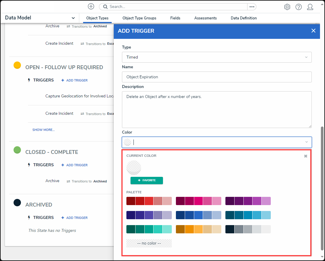 - (Optional) Select a color from the dropdown Color palette by clicking on a Color Swatch. A colored dot will appear next to the name of the trigger under the selected workflow state.
