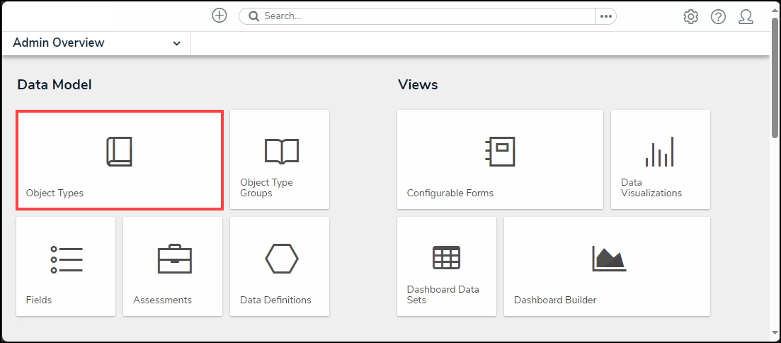 - From the Admin Overview screen, click the Object Type tile under the Data Model section.