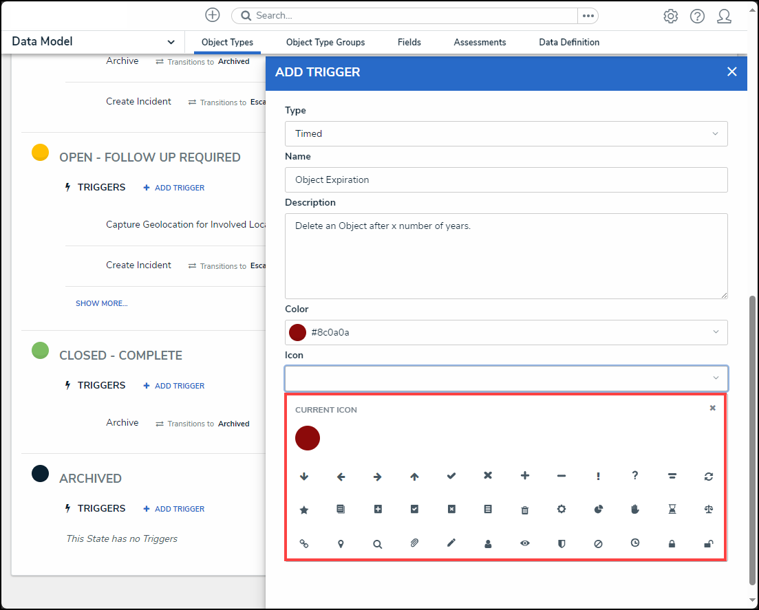 - (Optional) Select an icon from the Icon dropdown menu. The Icon will appear next to the name of the trigger under the selected workflow state.