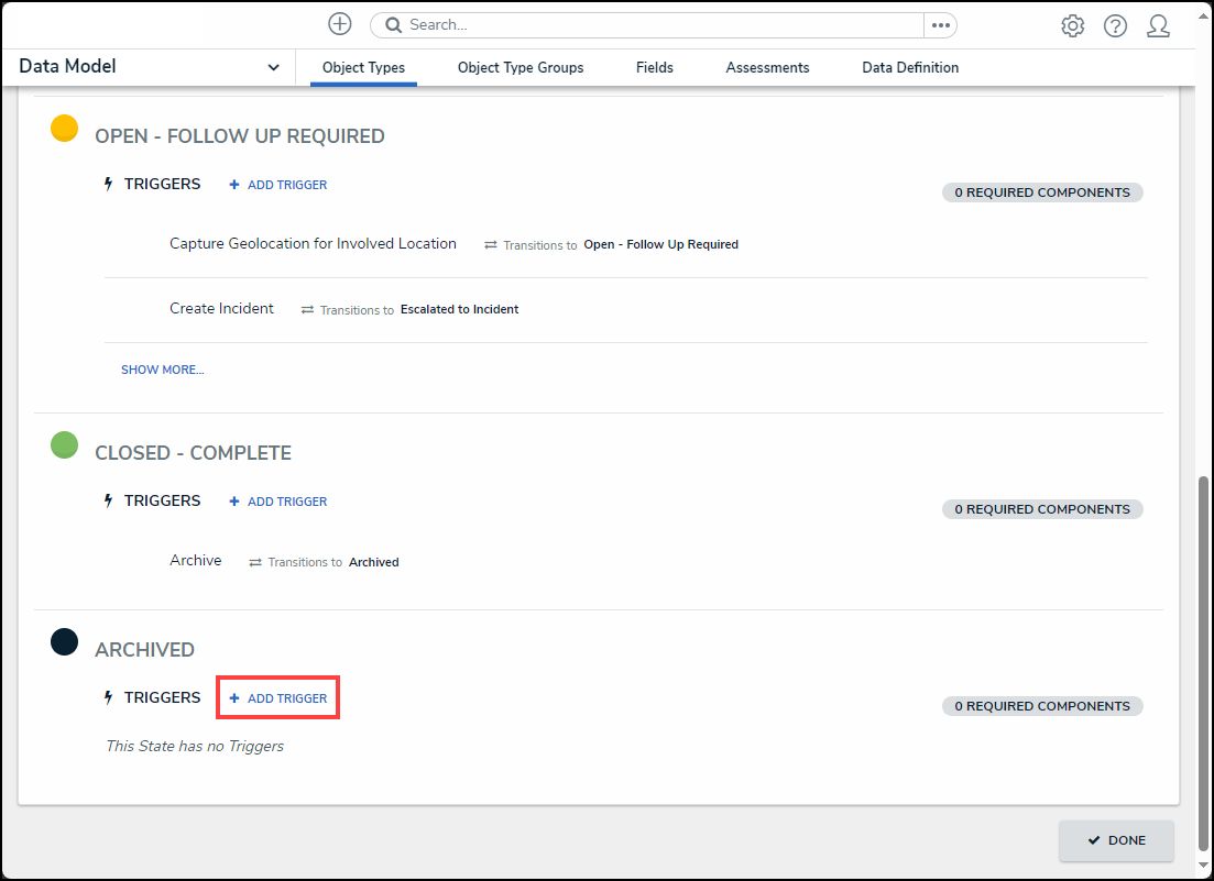 - From the Admin: Edit Workflow screen, click the + Add Trigger link under the workflow state where the data retention trigger will be added.