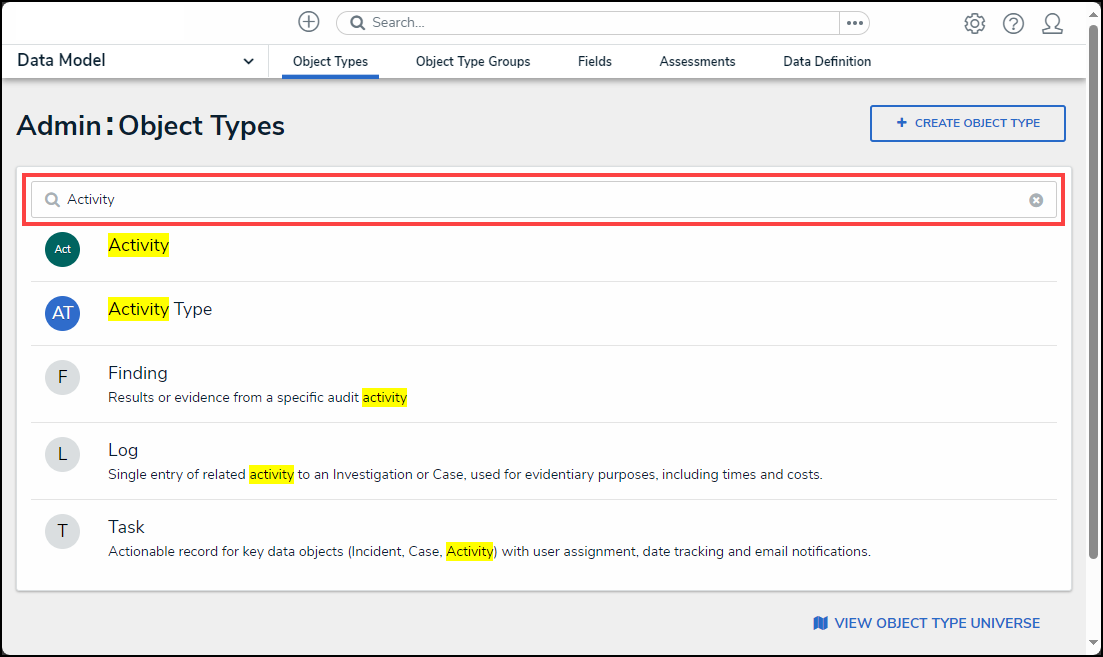 - From the Admin: Object Type screen, enter an object type name in the Search field to narrow the search results.