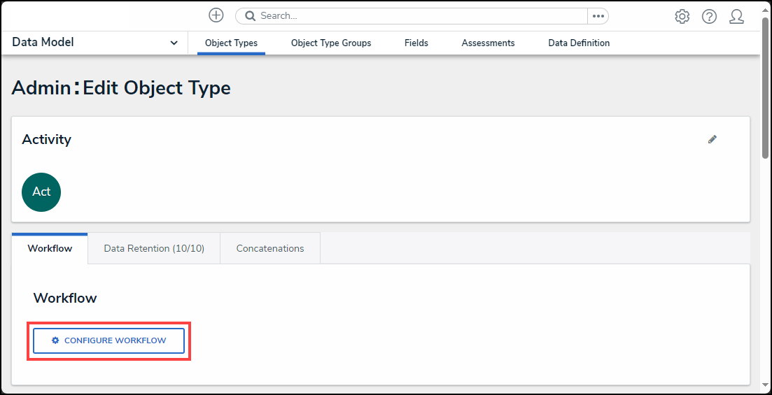 - From the Admin: Edit Object Type screen, click on the Configure Workflow button under the Workflow section.
