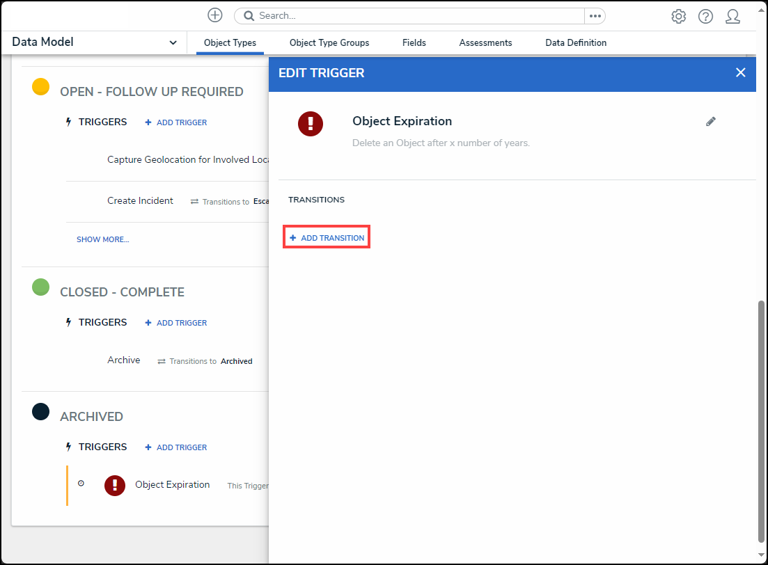 - From the Edit Trigger pop-up, click the + Add Transition link.