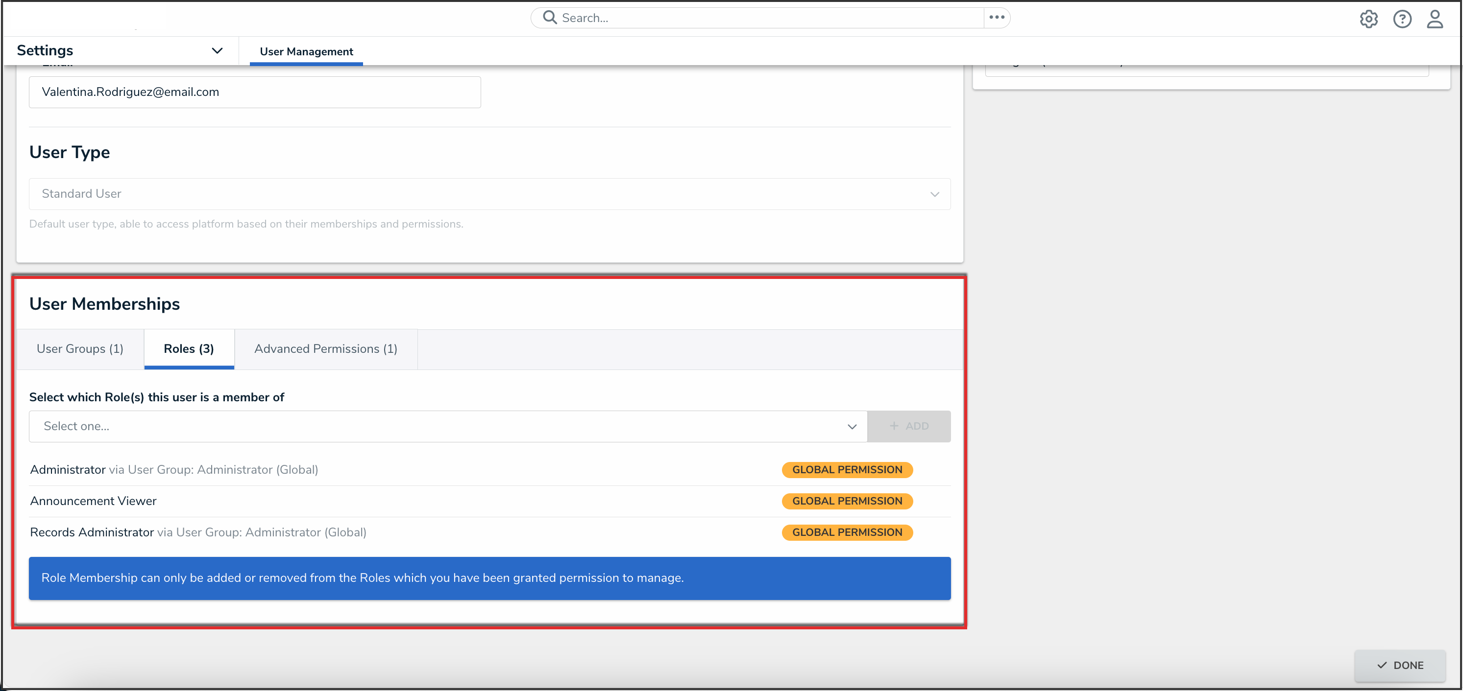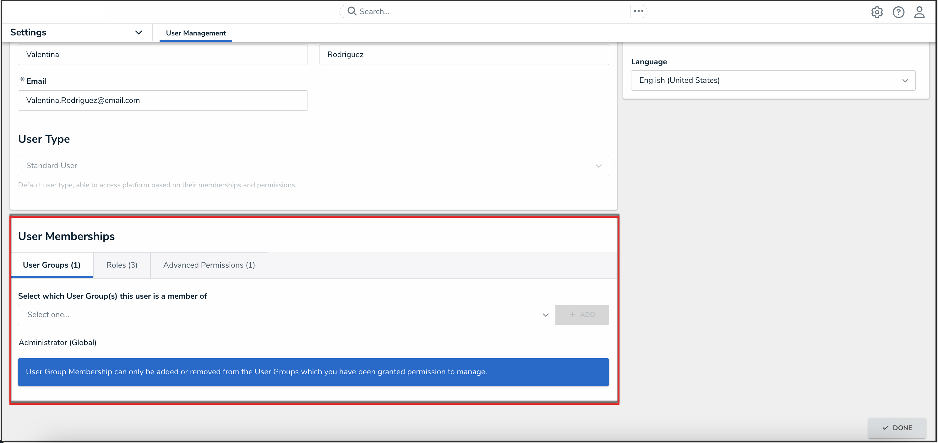 Tip: We recommend adding users to a user group via the User Memberships section to more accurately manage permissions for all the users in the same group. |