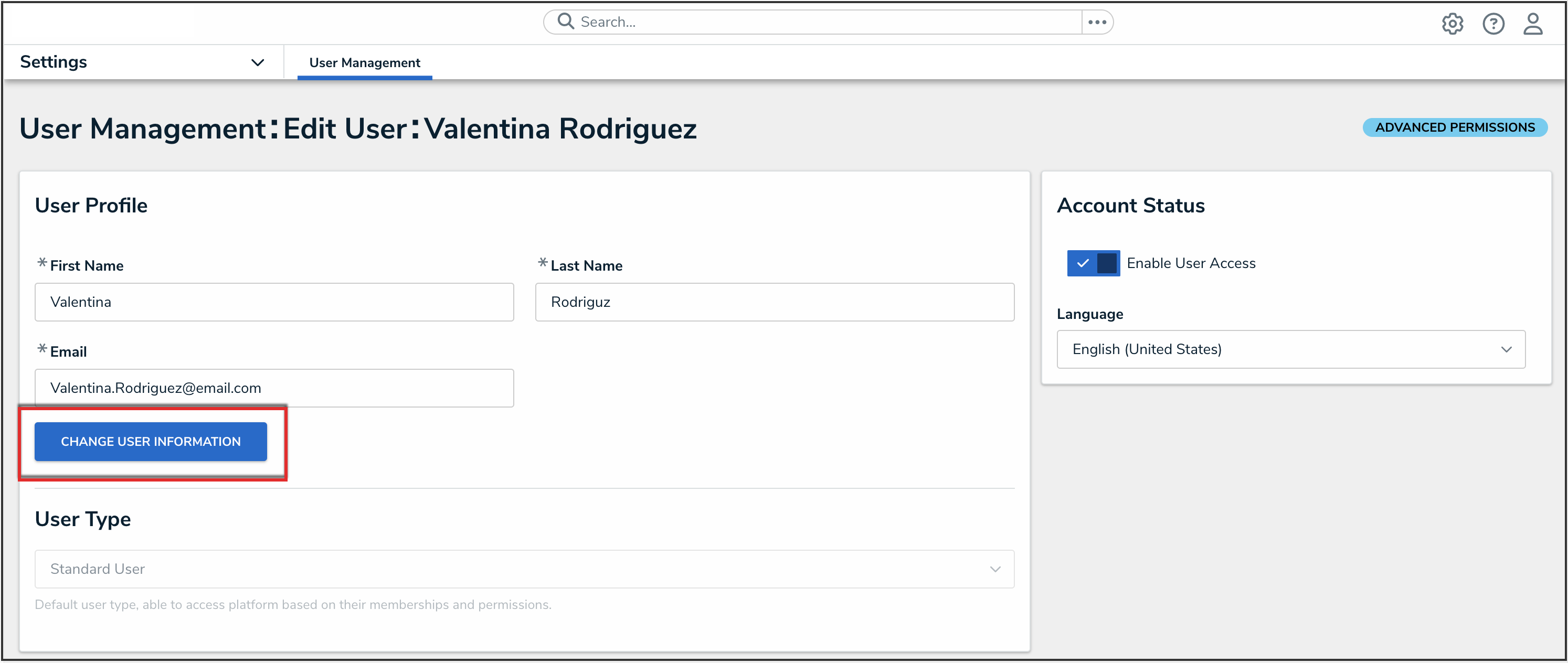 - Once you make an edit to one of these fields, click the Change User Information button to save the changes.
