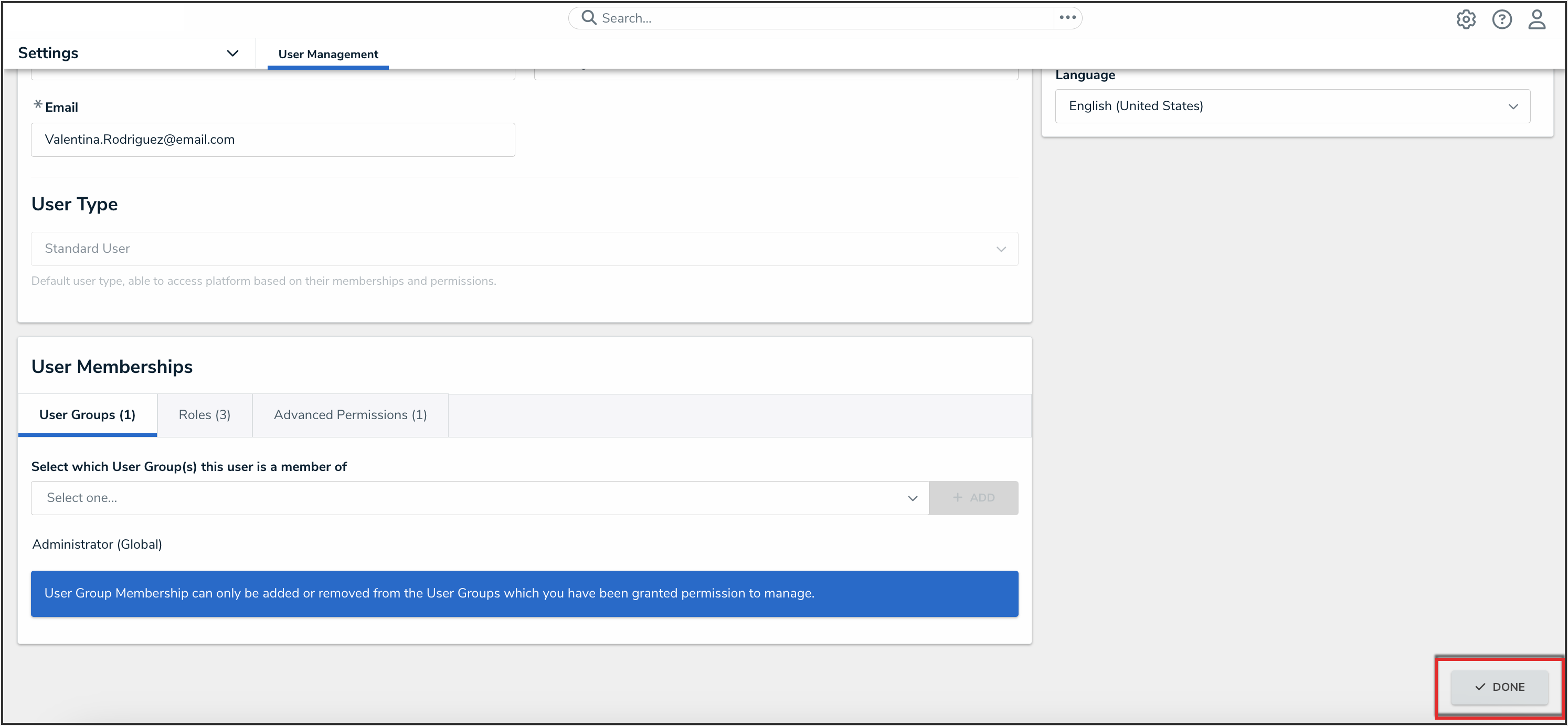 From the Edit User screen, a User Management or Settings Management advanced permission user can edit a user's information and add the user-to-user groups and roles.