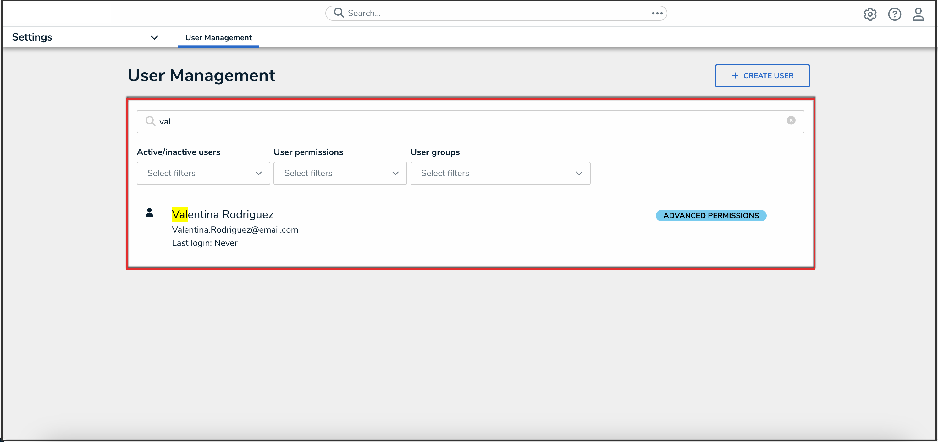 - Enter a user's name in the Search field to narrow the search results.