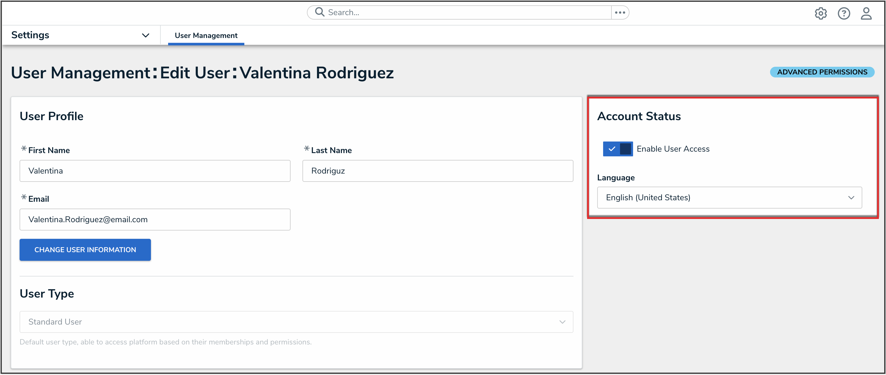 - In the Account Status section, select the Enable User Access toggle switch to enable (blue) or disable (grey) a user profile.