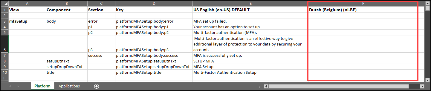 - From the Platform tab, filter the Language column (last column F) by empty cells, indicating new content.