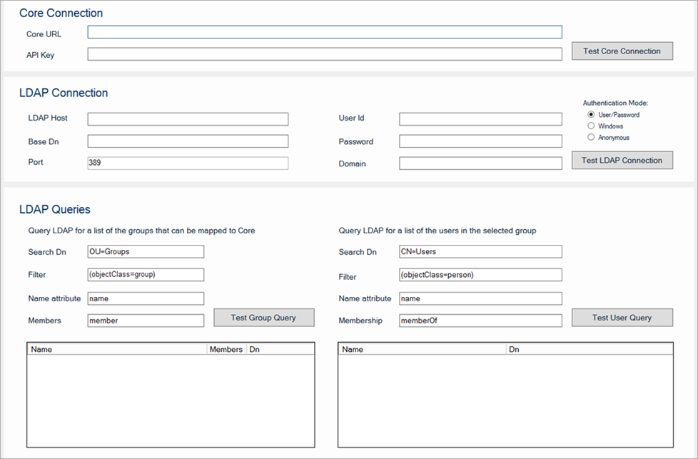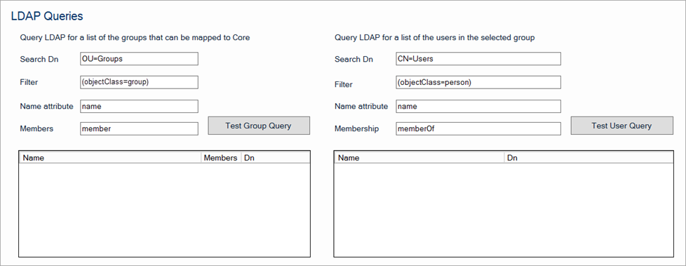 - In the LDAP Queries section, enter parameters into the following fields to define which users and/or groups will be synced into Core: