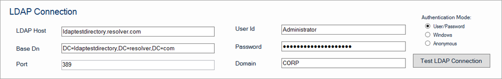 - LDAP Host: The DNS directory name of the LDAP server. This can be an IP address or fully qualified name (e.g. test.resolver.com).