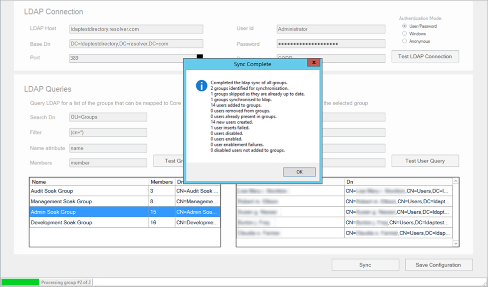 Clicking Test Group Query or Test User Query displays read-only results and does not sync any data into Core. - Click Save Configuration to save the values entered in the fields, which will be displayed the next time the tool is run.