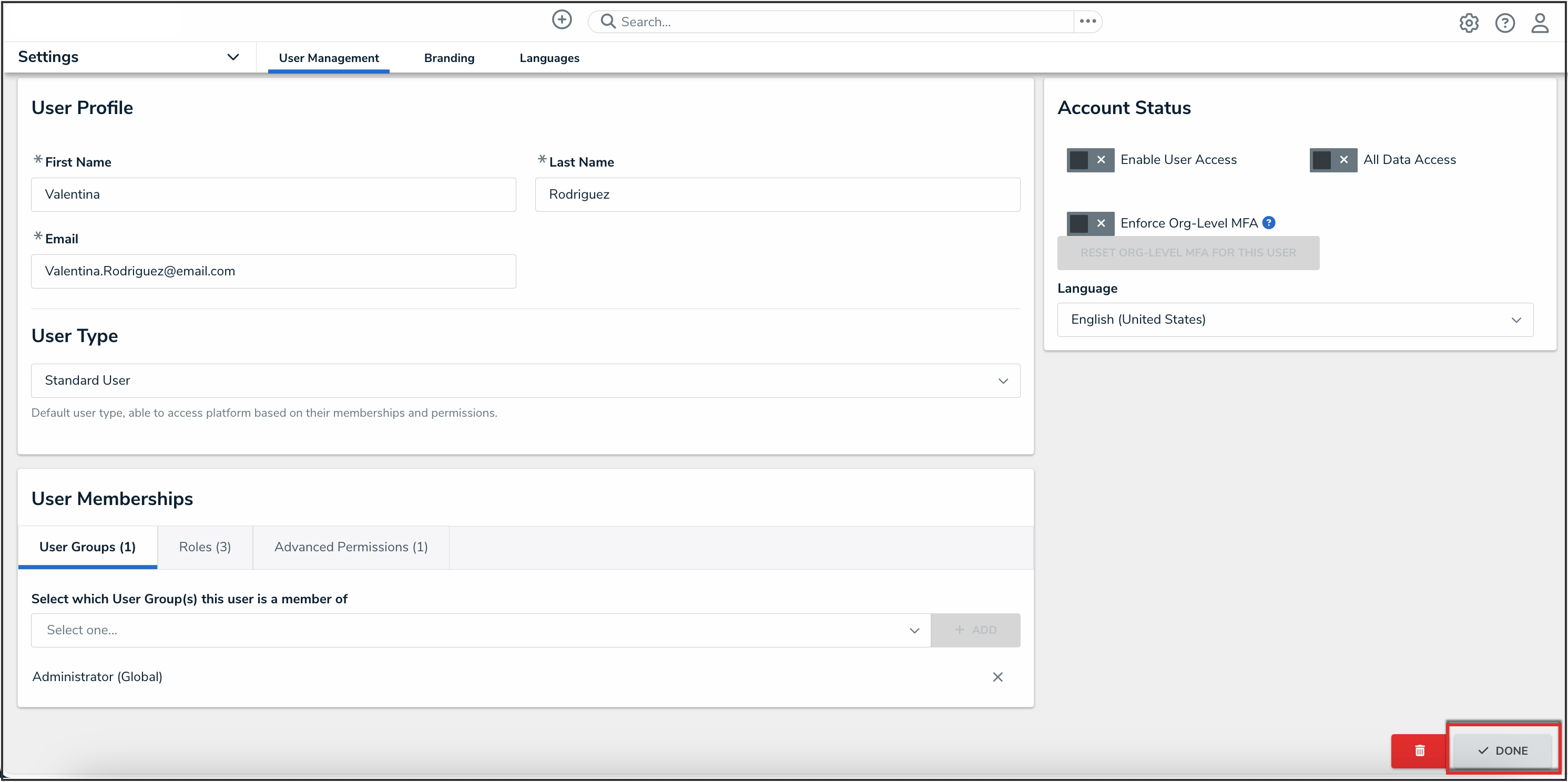 - Scroll to the bottom of the Edit User screen and click the Done button to save your changes. The user will now be indicated as inactive in the system.