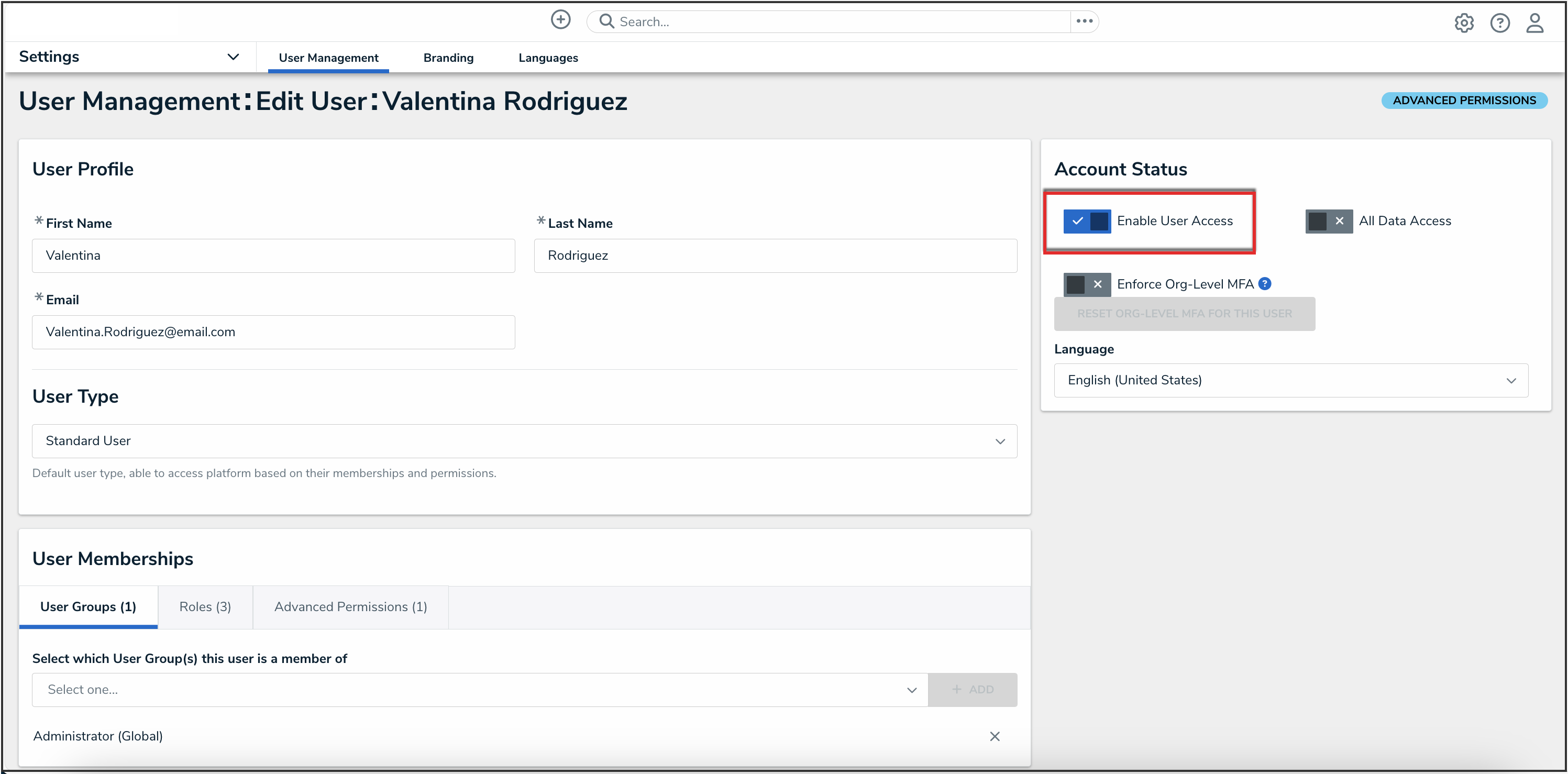 - From the Edit User screen, click the Enable User Access toggle switch to disable the user's account. The Enable User Access toggle switch will turn grey indicating the user profile is disabled.
