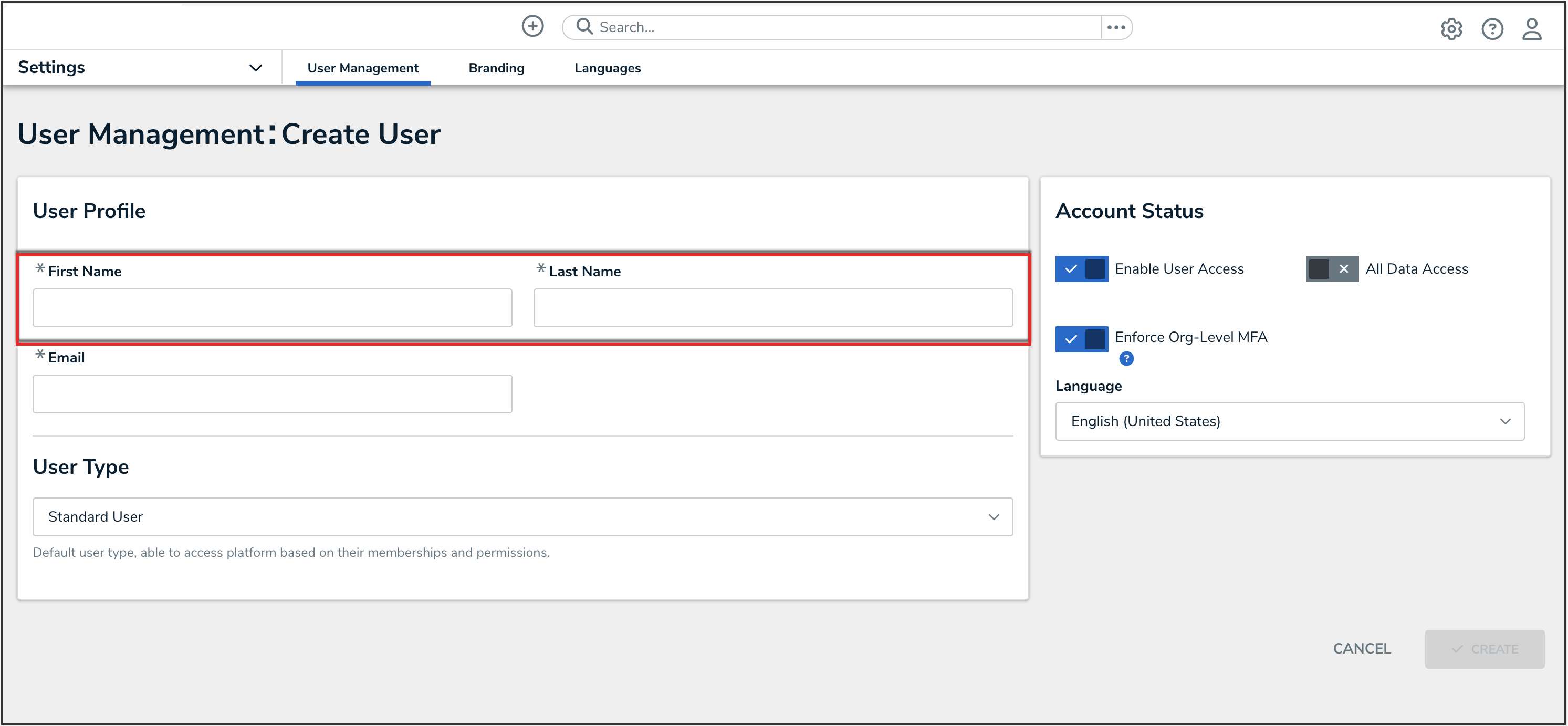Note: If you are a User Management or Settings Management advanced permissions creating a new user, please refer to the Create a New User as an Advanced Permissions User article. |