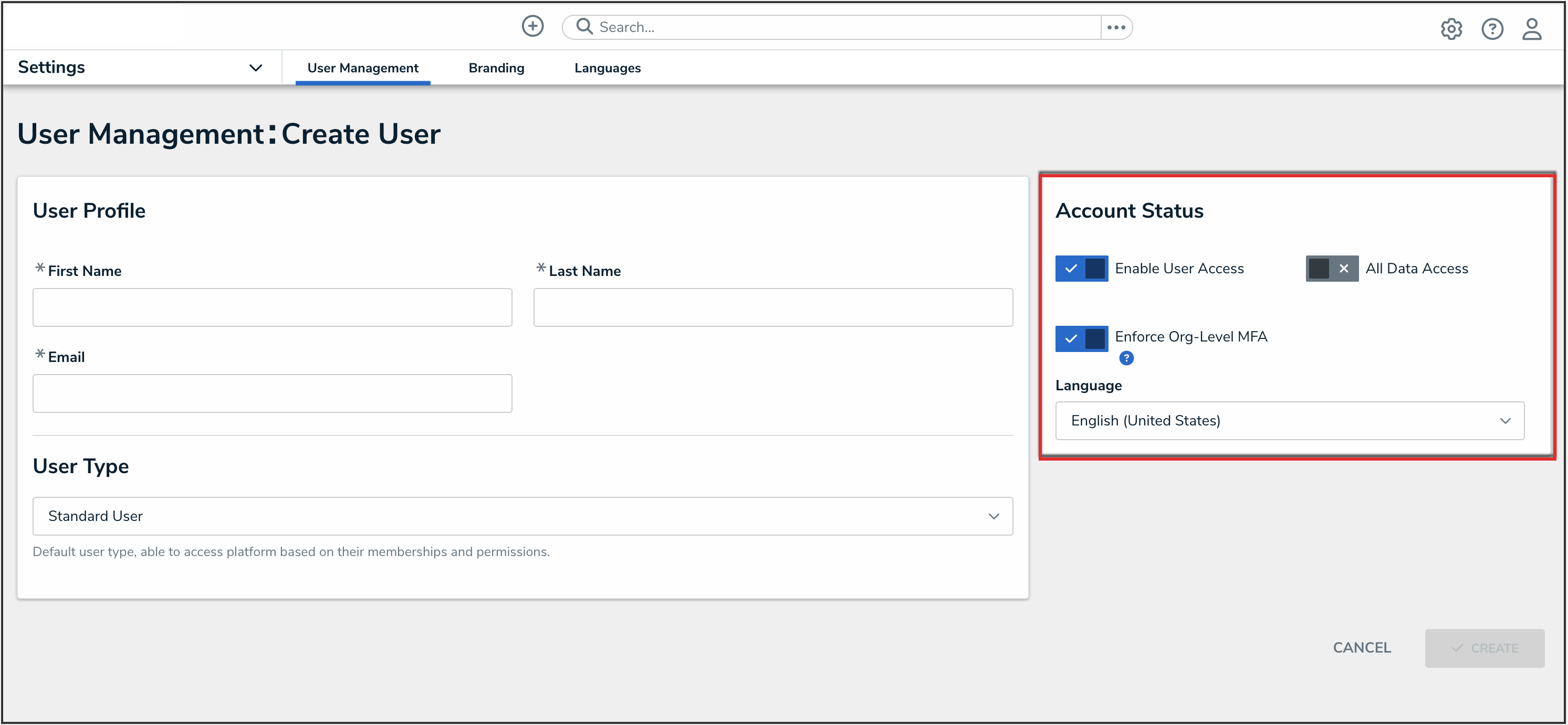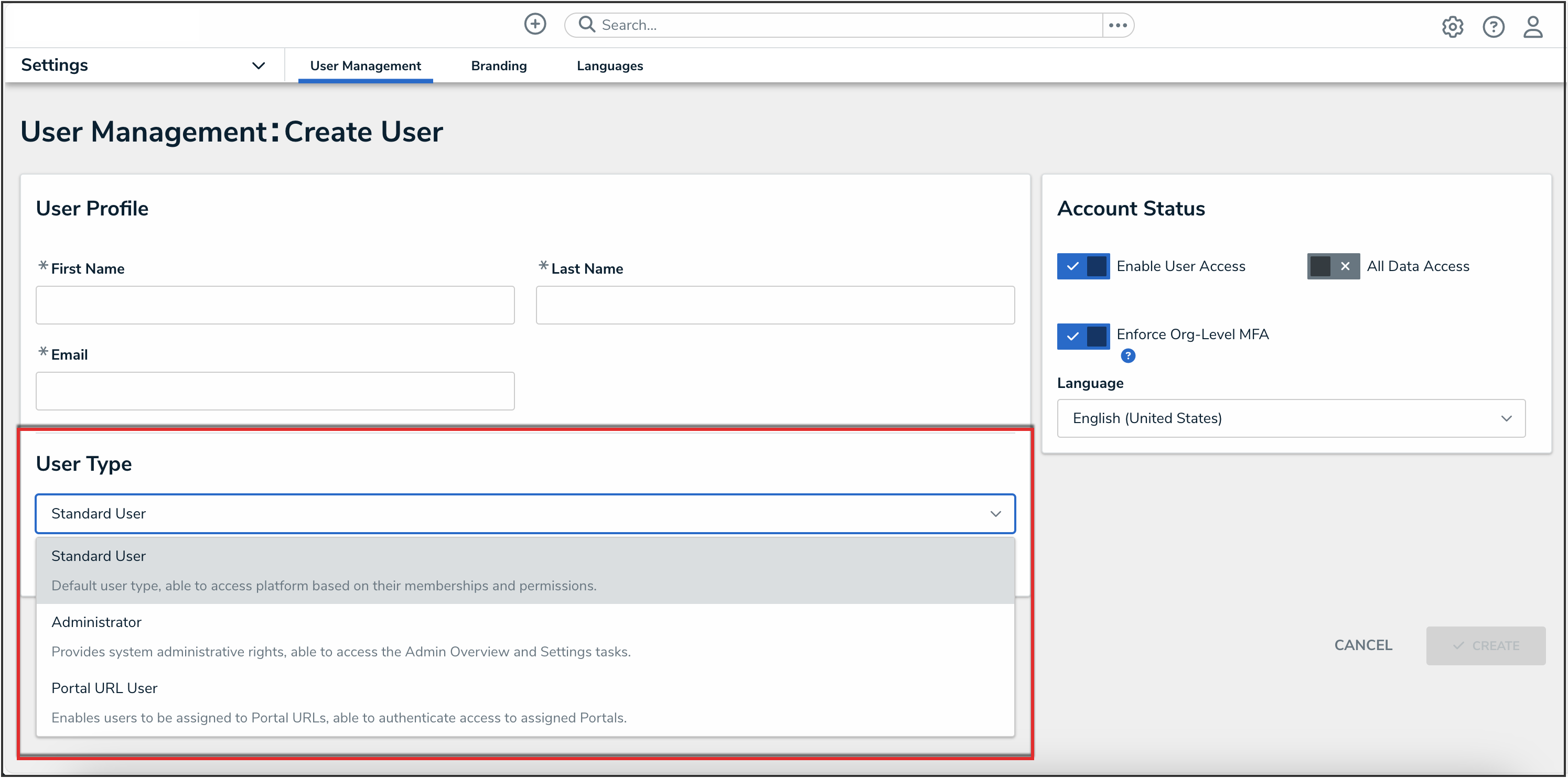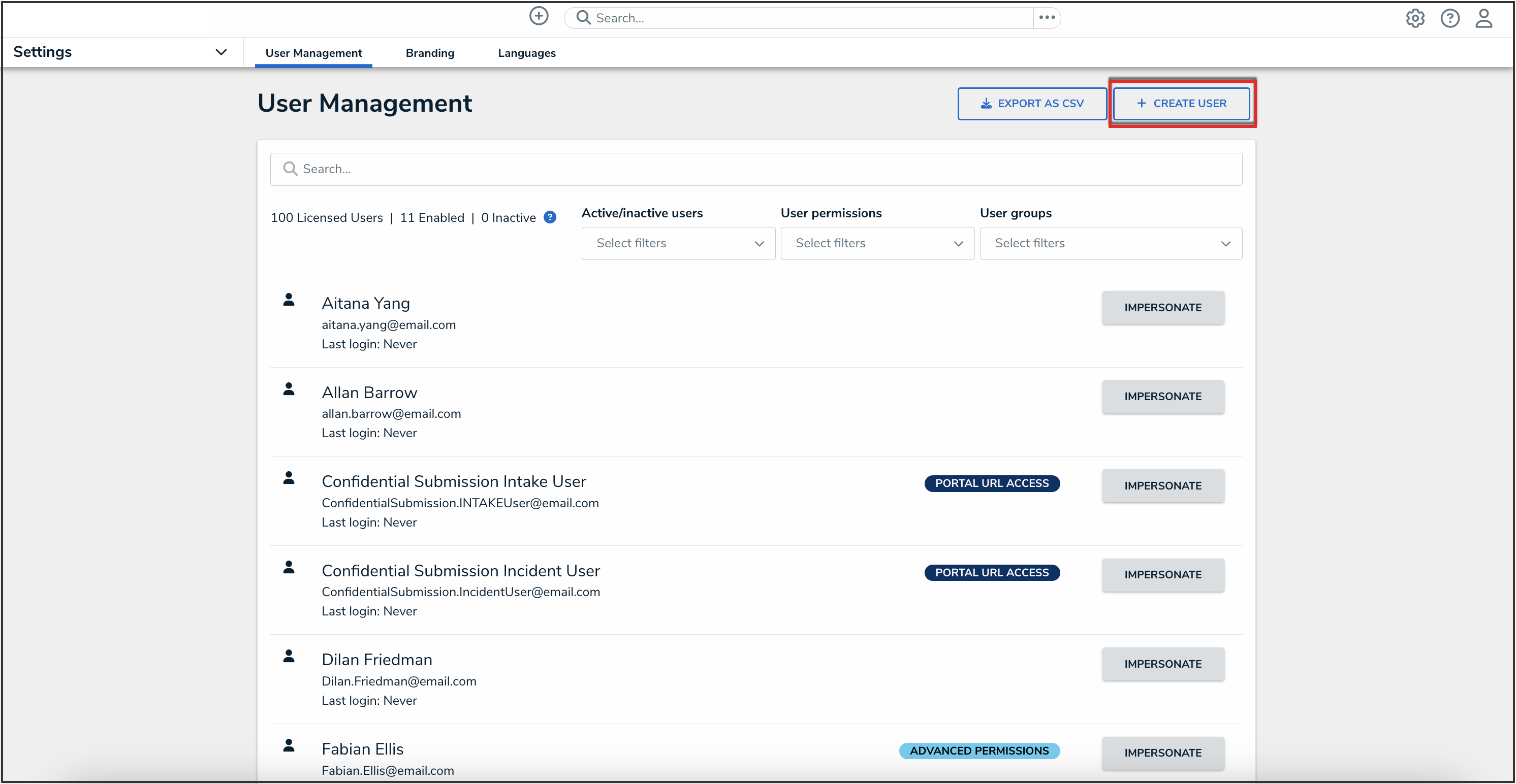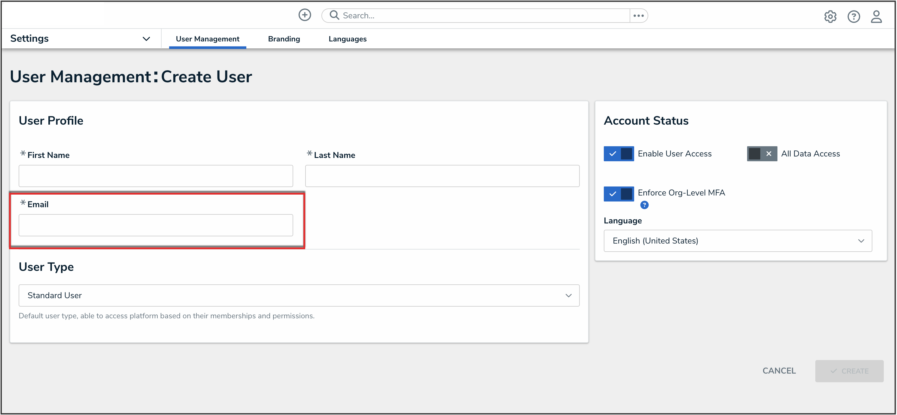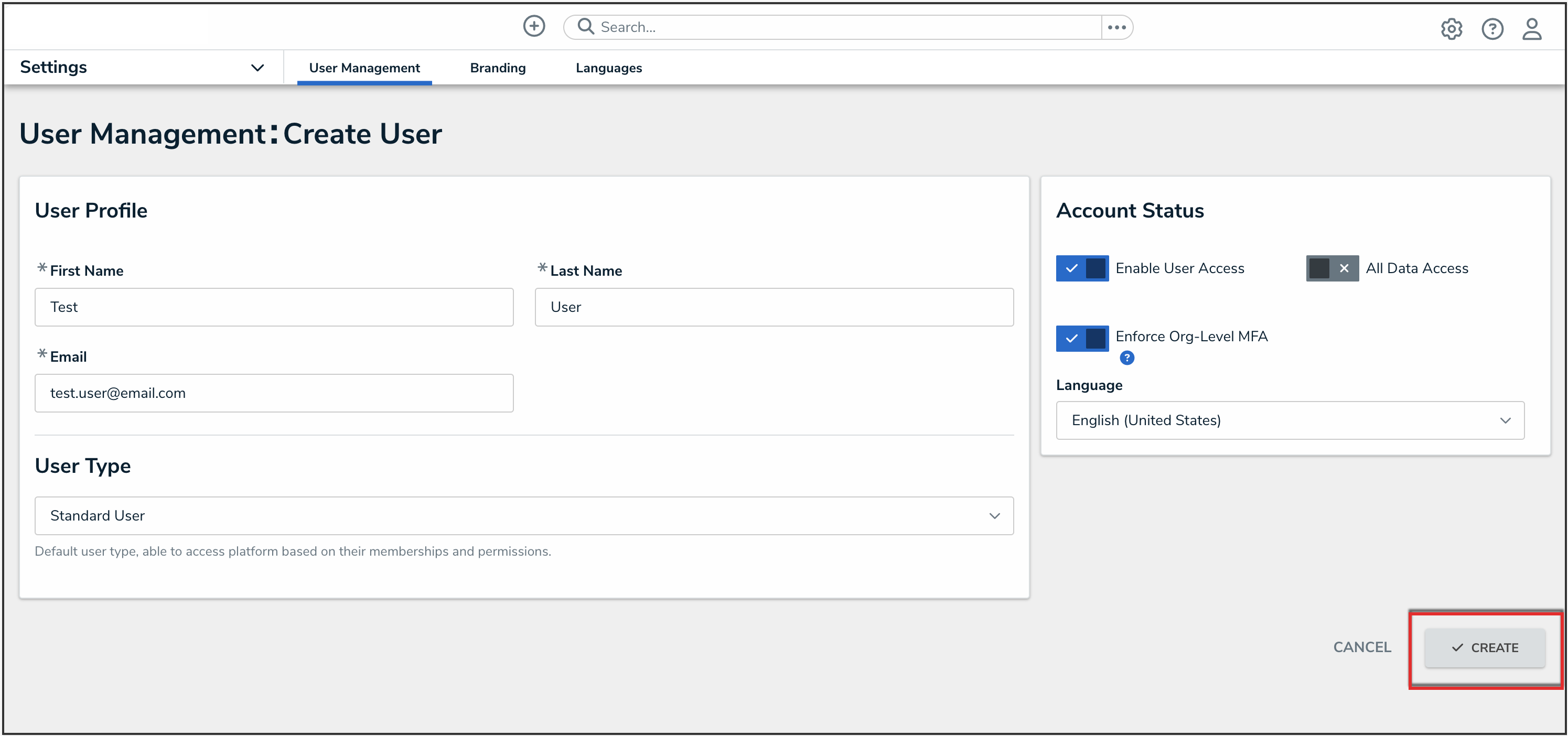 - From the User Management screen, click the Create User button.