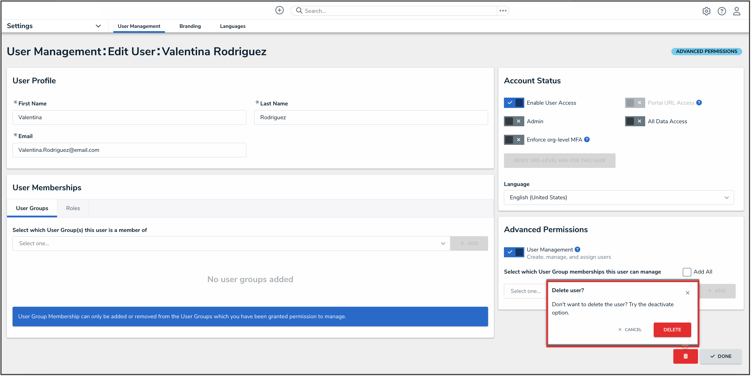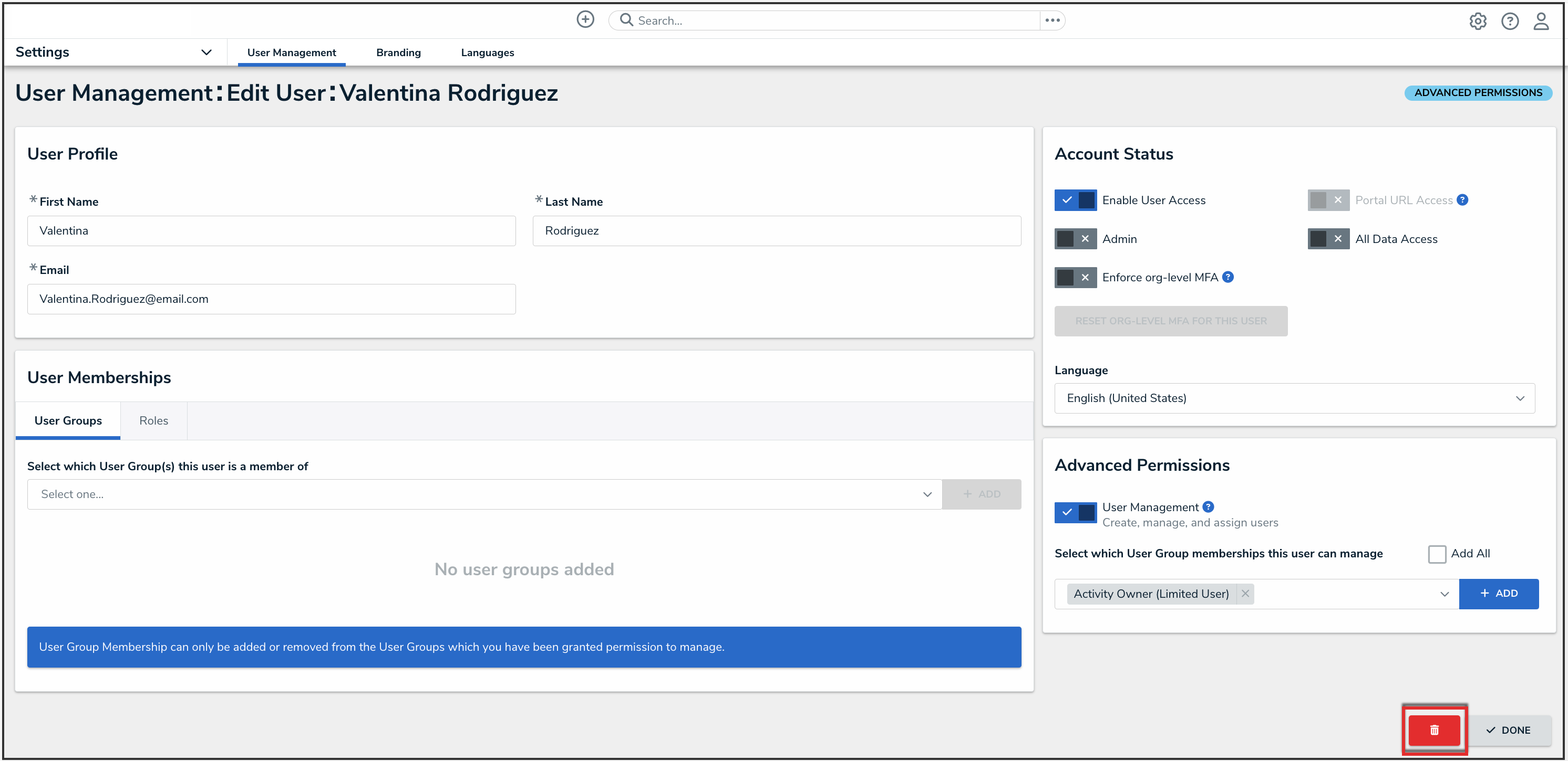 - From the Edit User screen, click the Delete icon to delete the user profile.