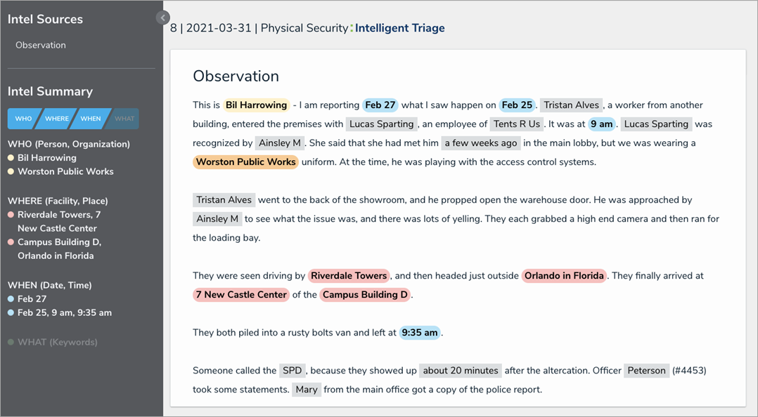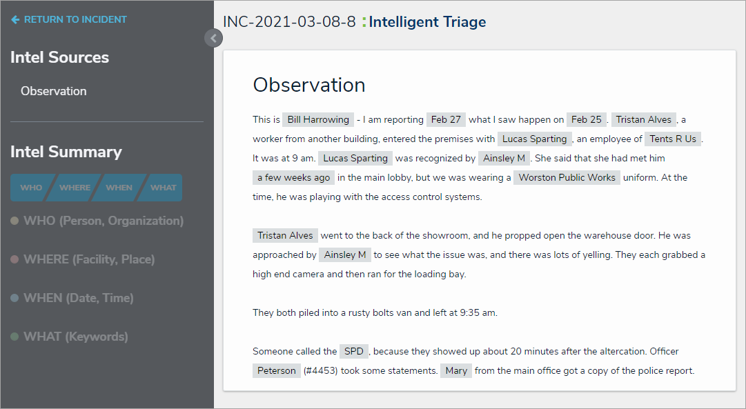 - Continue to repeat the above steps, as needed. Saved involvements appear in the Intel Summary section.