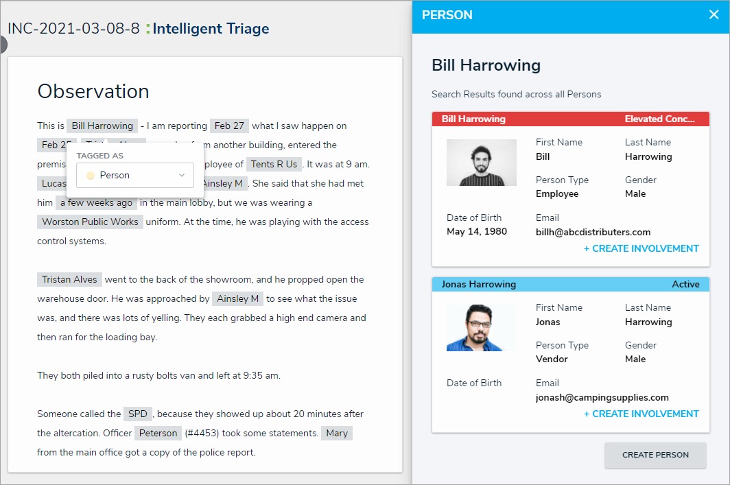 For more detailed information on the different entity types and how they're tagged, see Intelligent Triage Entities. - If an existing object matches the entity, click Create Involvement below that object. To create a new record, click Create [Entity Type], which will create a new library object with an involvement on the current incident.