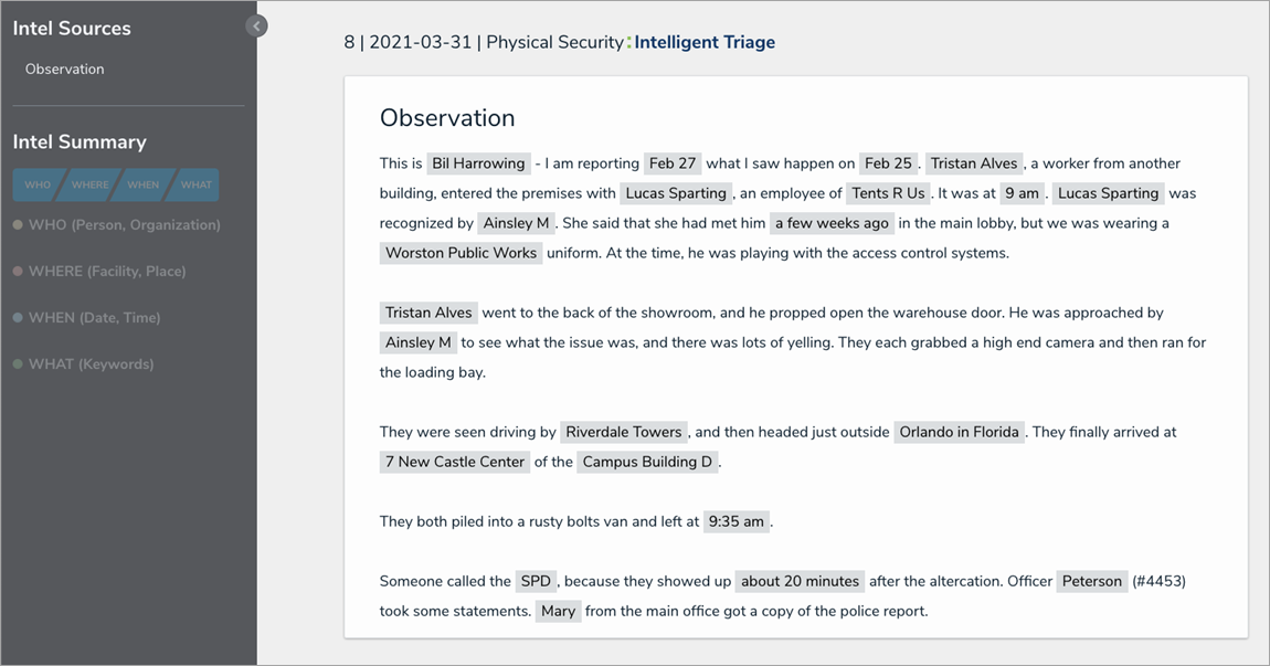 Times: Can include observed dates and times, incident start or end dates, follow-up dates, etc. Intelligent Triage will highlight specific times (e.g., 9:35 am) as well as less-specific times (e.g., a few weeks ago). Clicking on a highlighted time will display the closest date, which can then be refined in the calendar picker and paired to the appropriate date field. Times appear in the When section of the Intel Summary and are highlighted in blue.