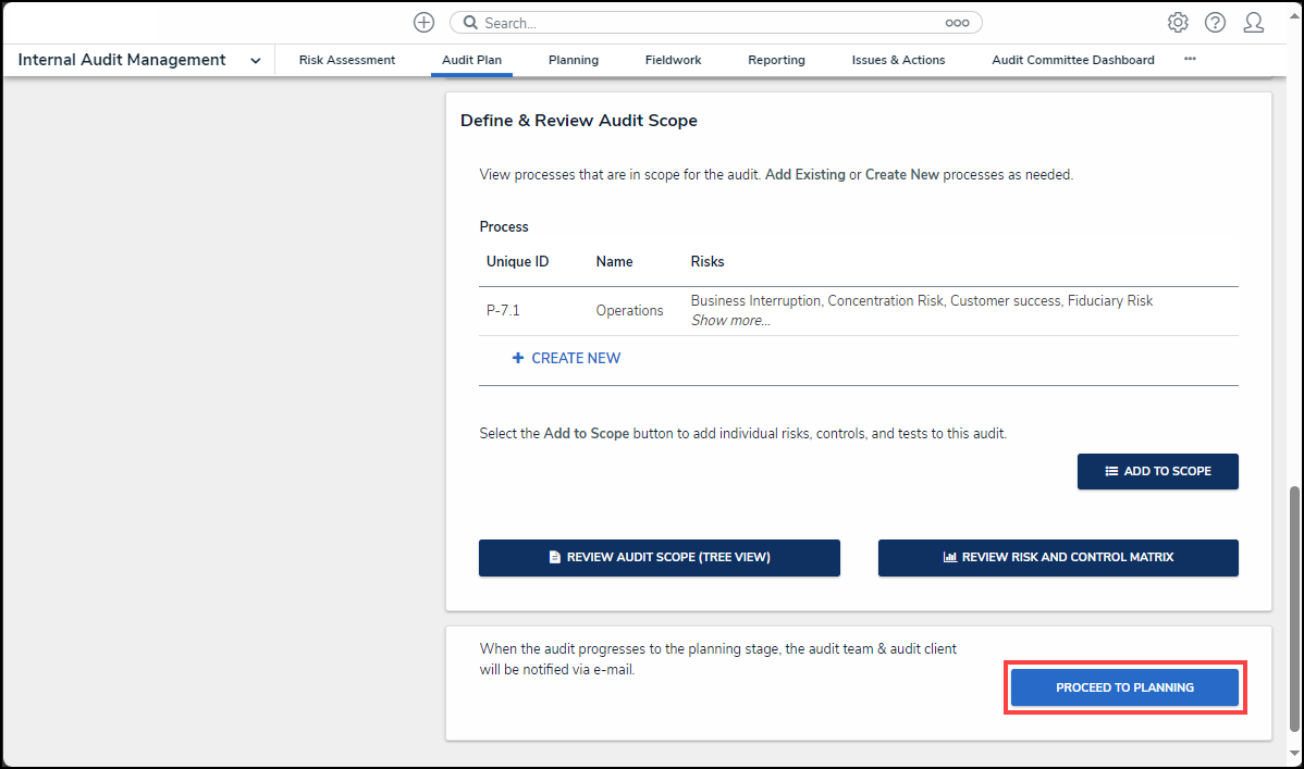 - Click the Process to Planning button to move the Internal Audit Project to the planning stage.
