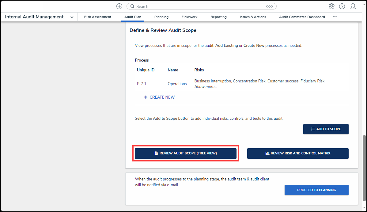 - (Optional) Click the Review Audit Scope button to open the Process Tree View screen, allowing you to view Risks, Controls, and Tests attached to the process.