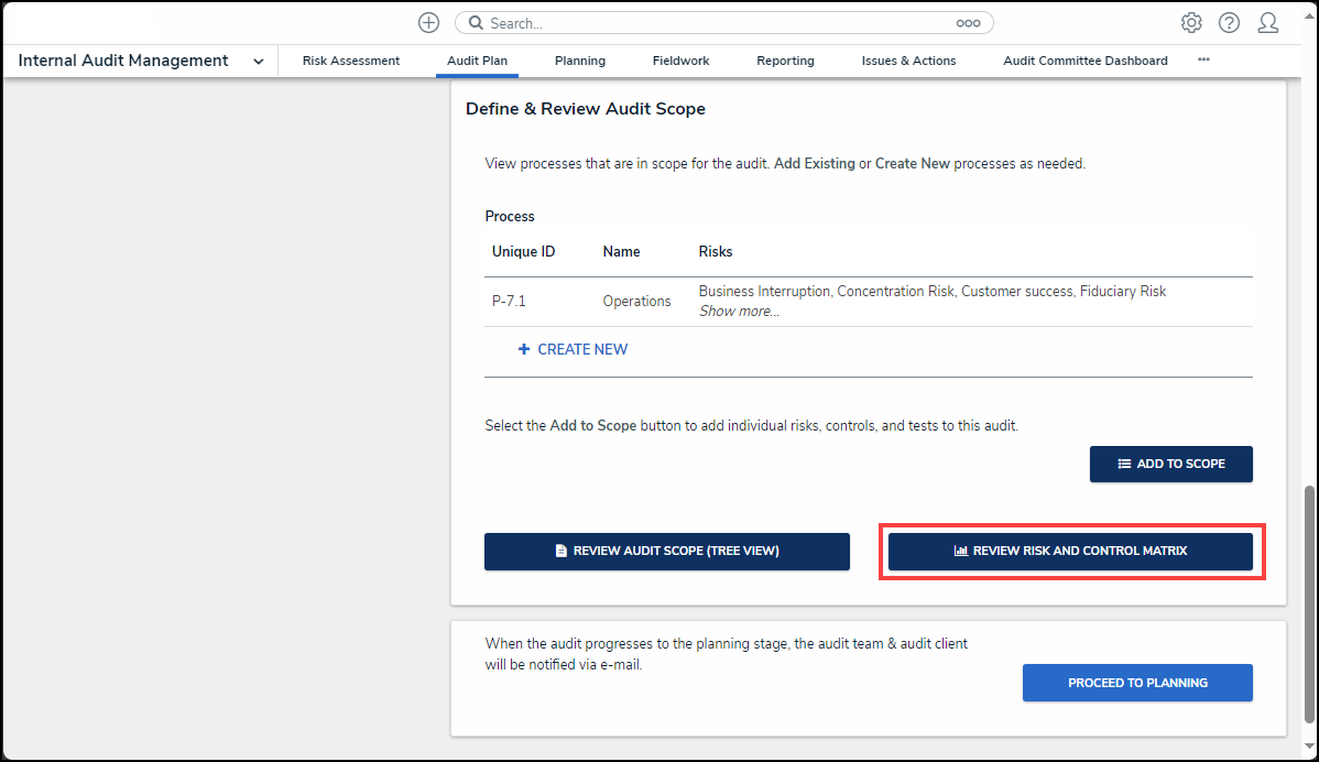 - (Optional) Click the Review Risk and Control Matrix button to view a data grid, showing each process and its attached Risks, Controls, and Tests.