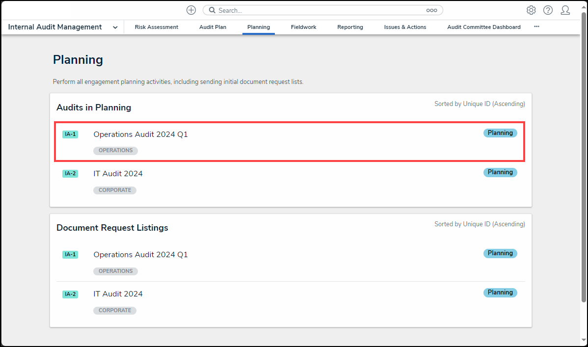 - The Internal Audit Project will move to the Audits in Planning section on the Planning screen.