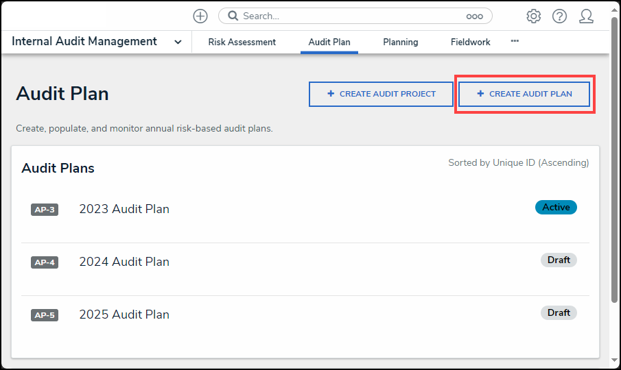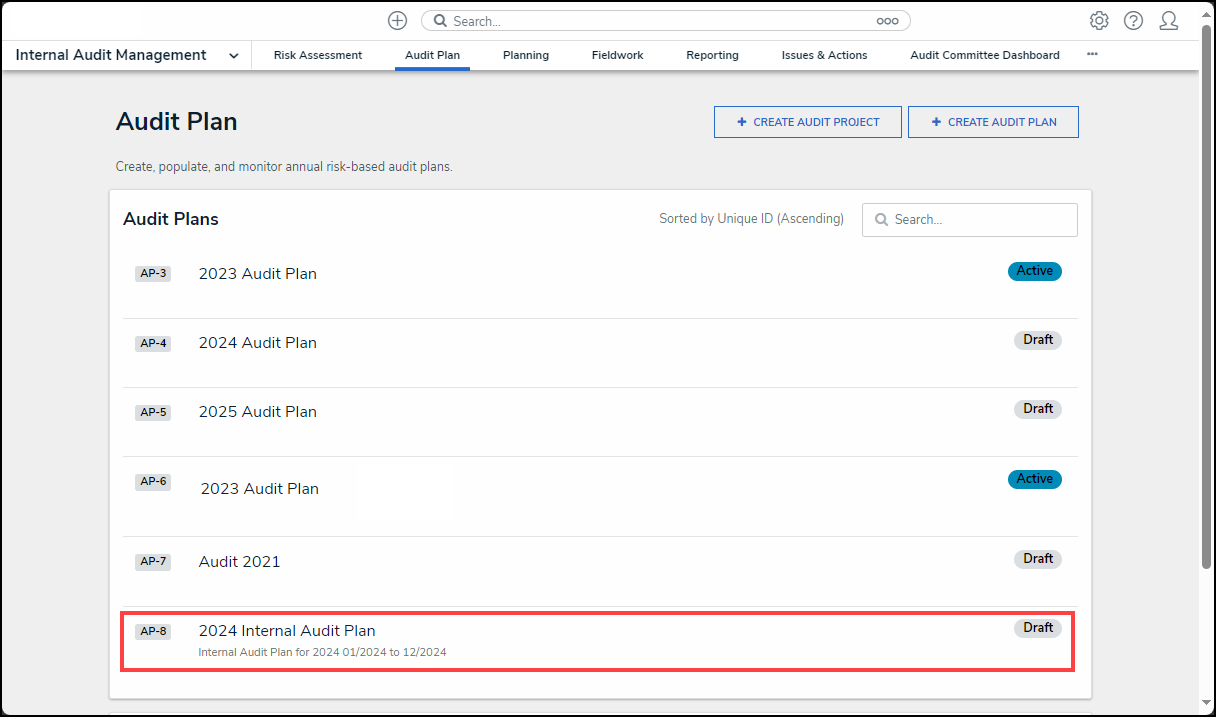 - The Audit Plan will appear under the Audit Plans section with a Draft status on the Audit Plan screen.