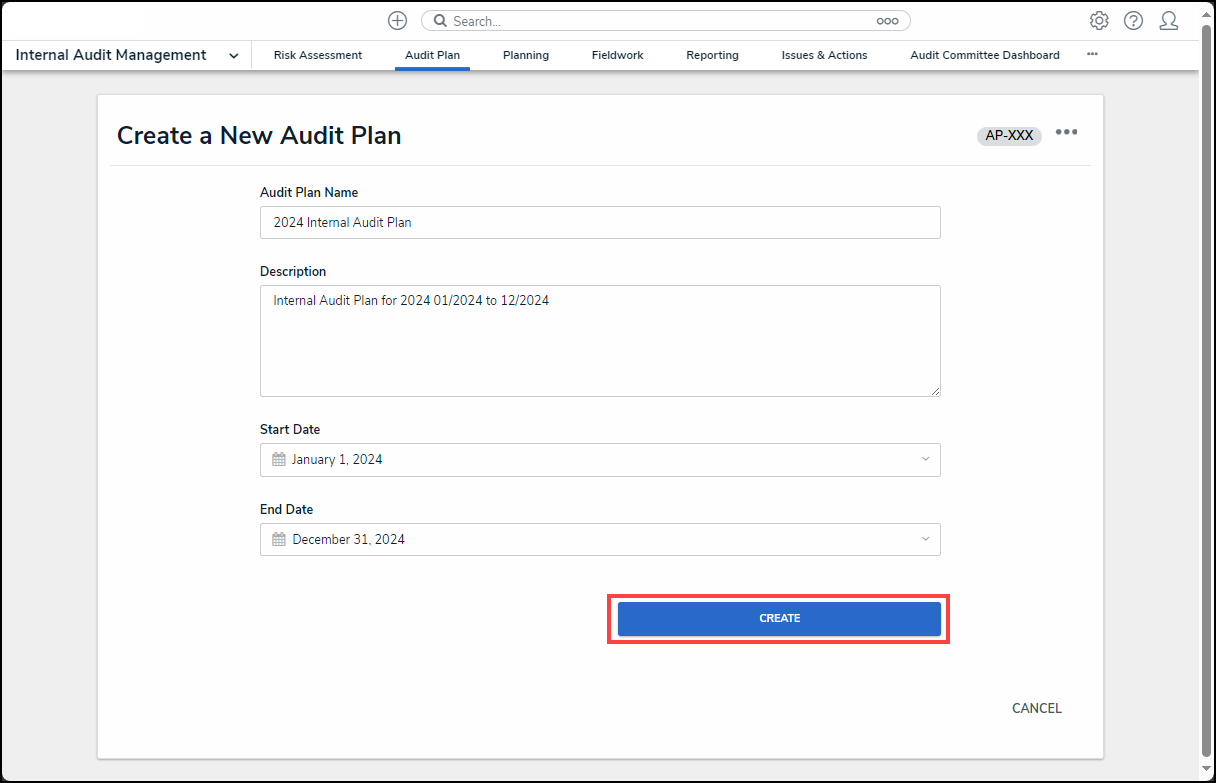 - From the Audit Plan screen, click on the Create Audit Plan button.