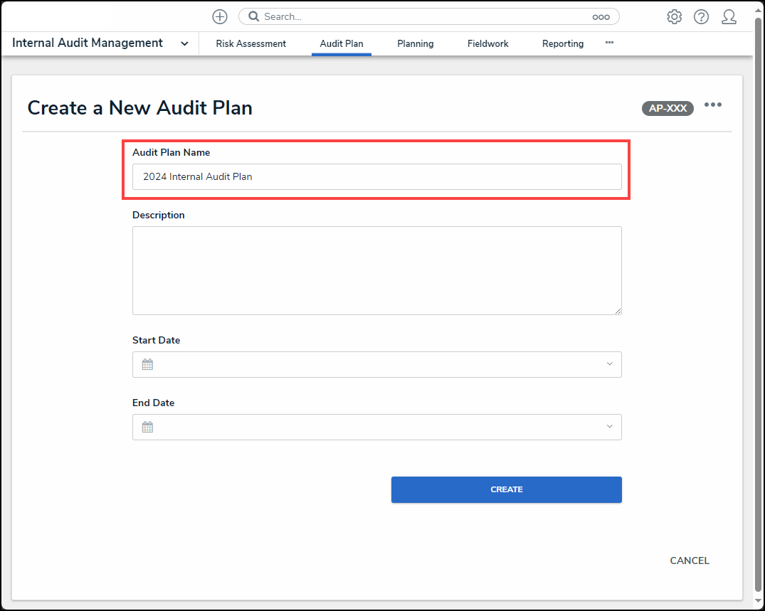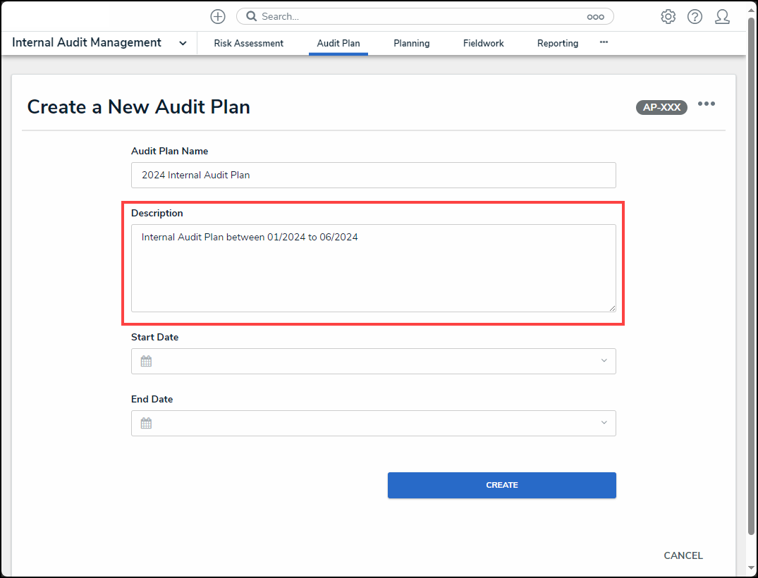 - Enter a brief Audit Plan description in the Description field. An Audit Plan Description allows you to add more detail, differentiating it from other Audit Plans.
