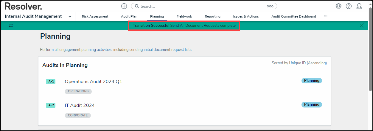 - The Planning screen will appear with a system-generated banner at the top of the screen, indicating that all document requests were sent to the Audit Clients.