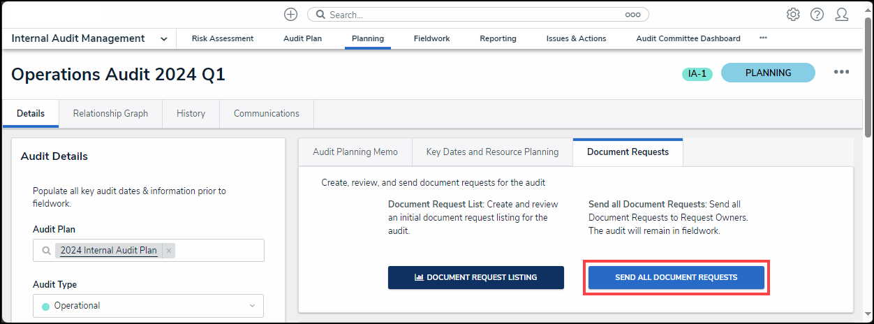 - From the Internal Audit Project screen, click the Document Requests tab.