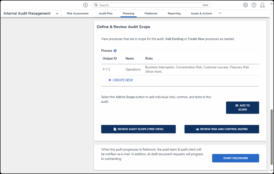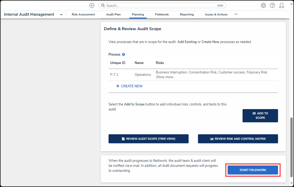 - Click the Start Fieldwork button to move the Internal Audit Project to the Fieldwork status.