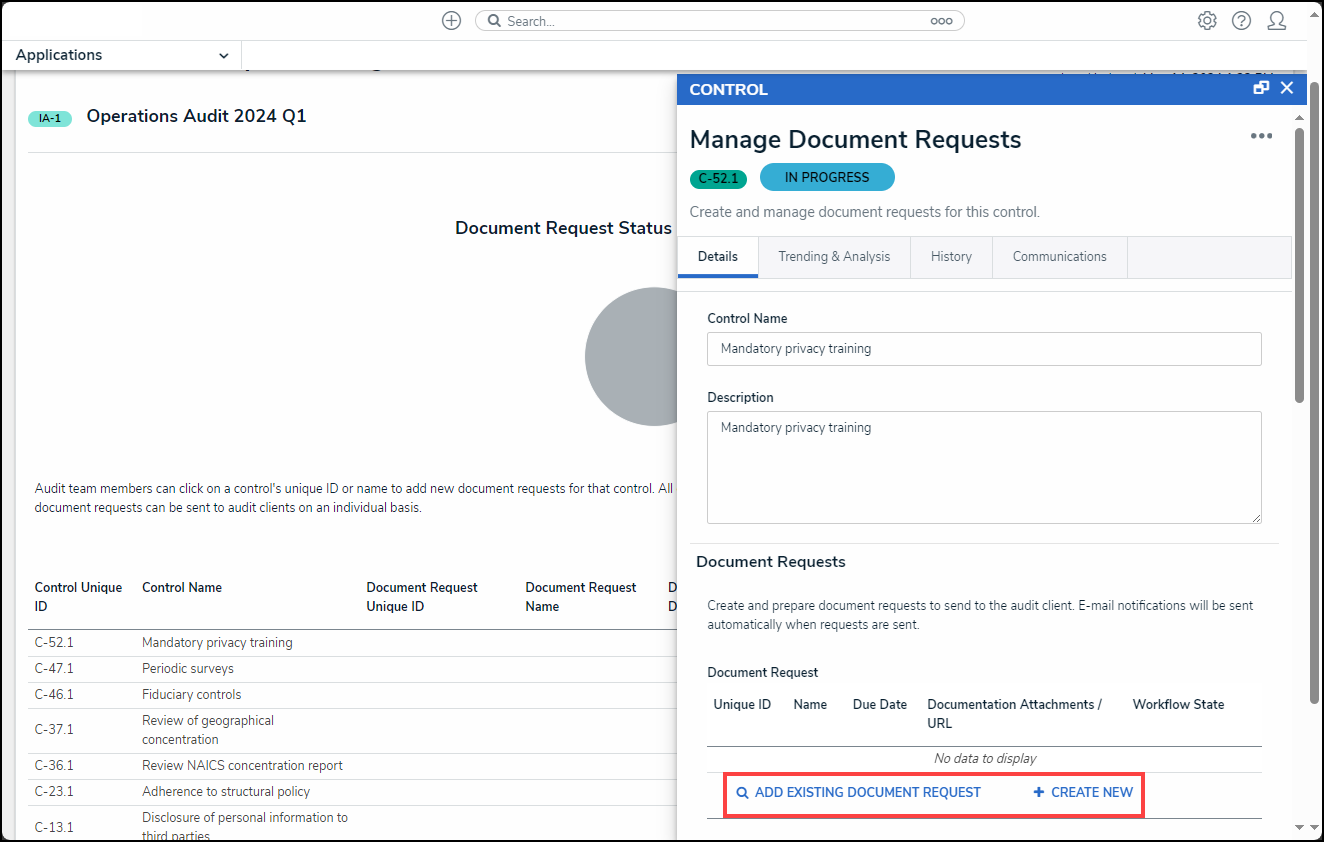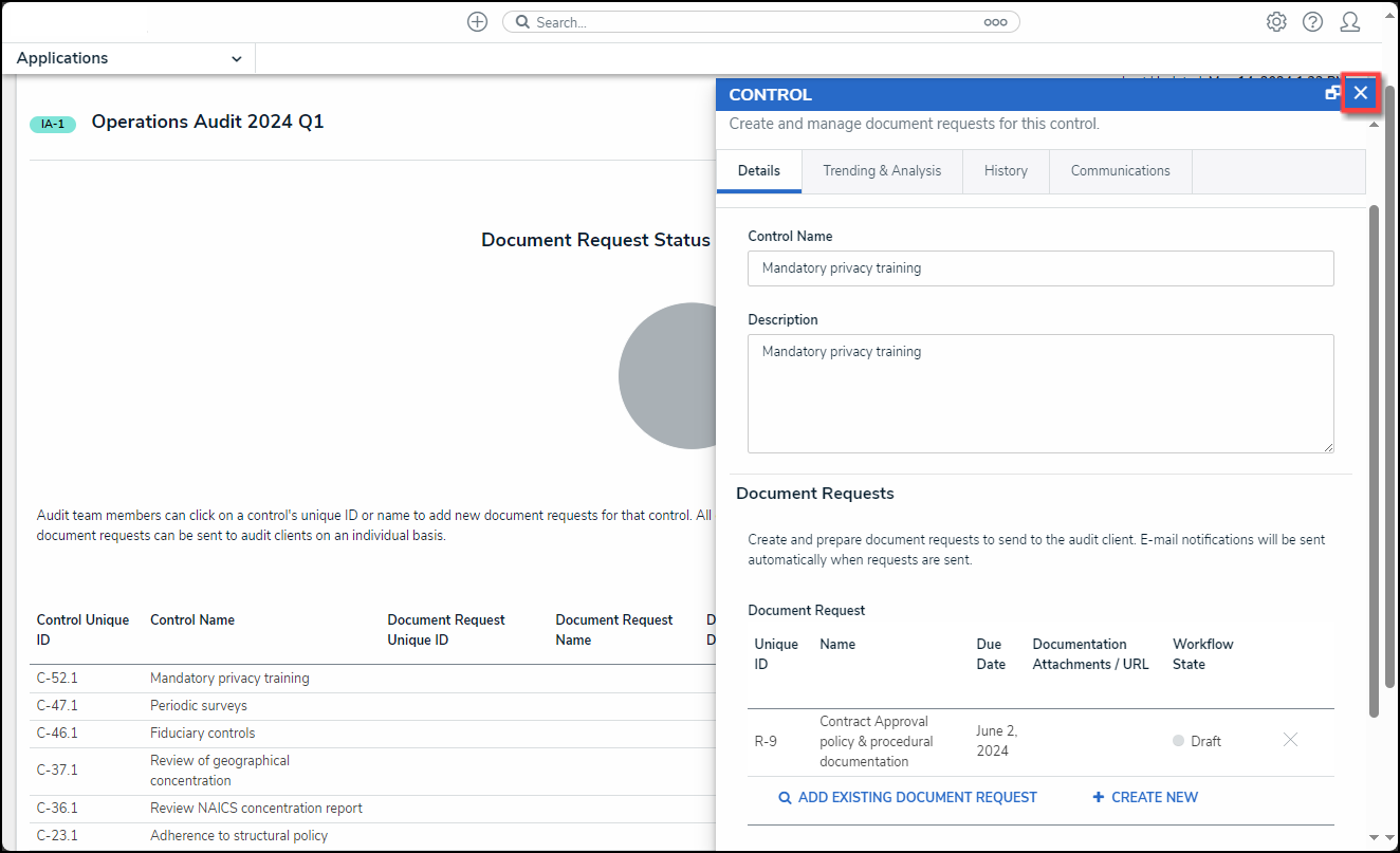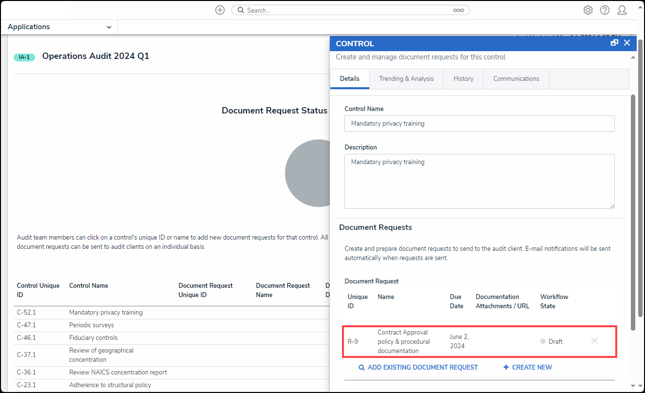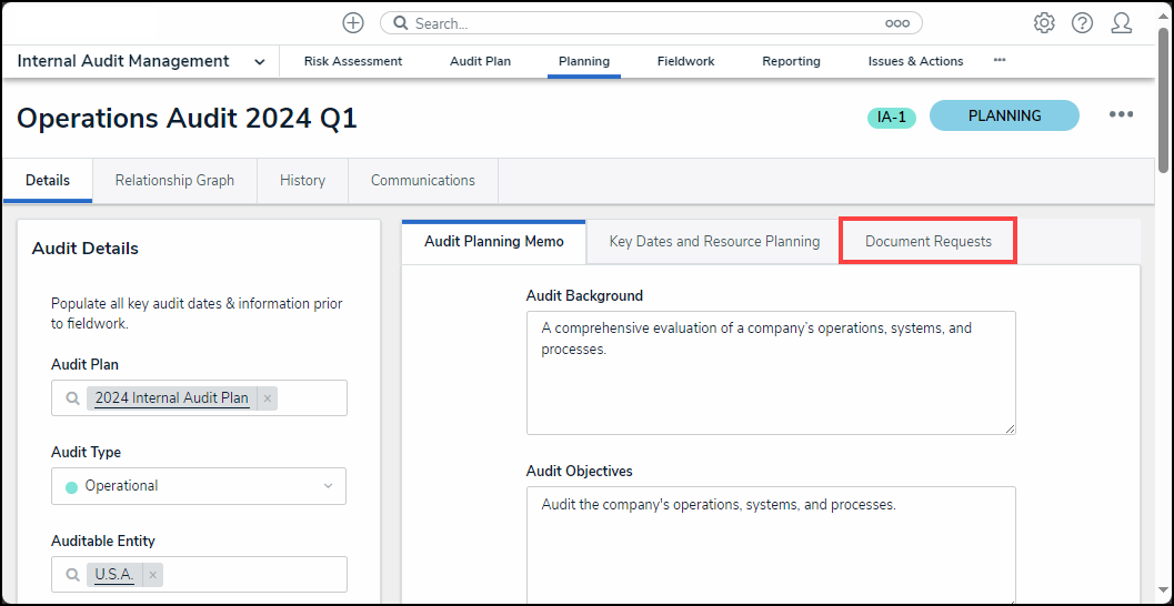 - Select one of the following options to add a document request to the Internal Audit Project: