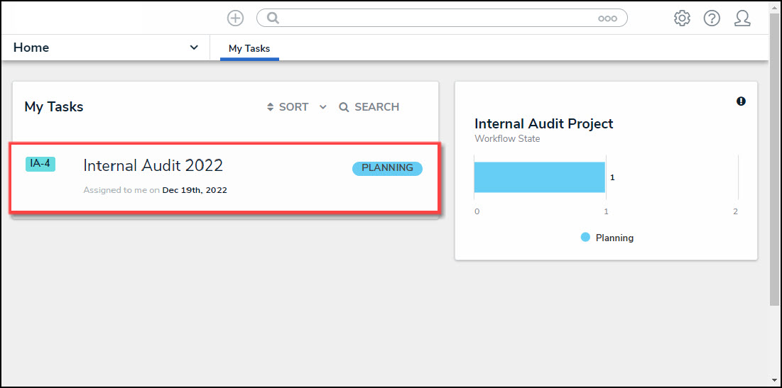 - From the Home screen, click on an Internal Audit Project in the Planning stage from the My Tasks section.