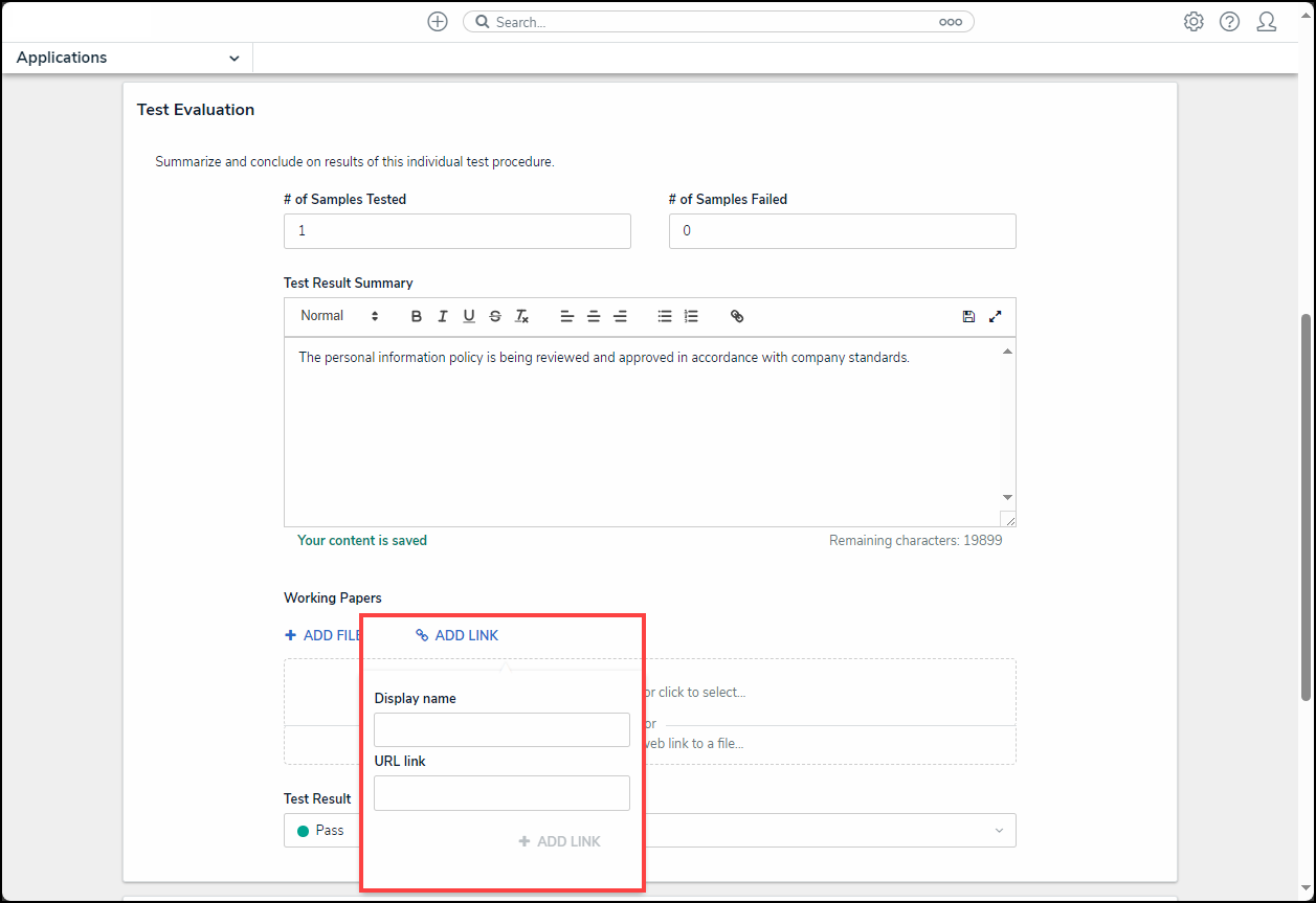 - Working Papers: Add supporting document files (up to 100 MB per file) to the Audit by dragging and dropping the files in the designated area or clicking the Add File link and selecting a file from the connected PC, the following file types .bat, .exe, .gif, .sh, .dll, and .com cannot be uploaded. You can also add web links to supporting documents by clicking on the Click to add a web link to a file section within the Working Papers field or clicking the Add Link link. Enter a Display Name and URL Link on the Web Link pop-up and click the + Add Link button to add a web link.