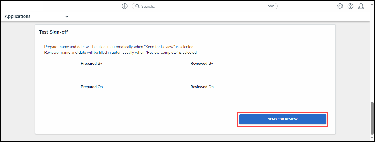 Click Send for Review to send the test to the Internal Audit Lead for review. The system will automatically fill out the Prepared By and Prepared On fields using the ID of the user who sent the test for review and today's date.