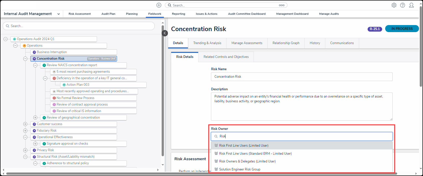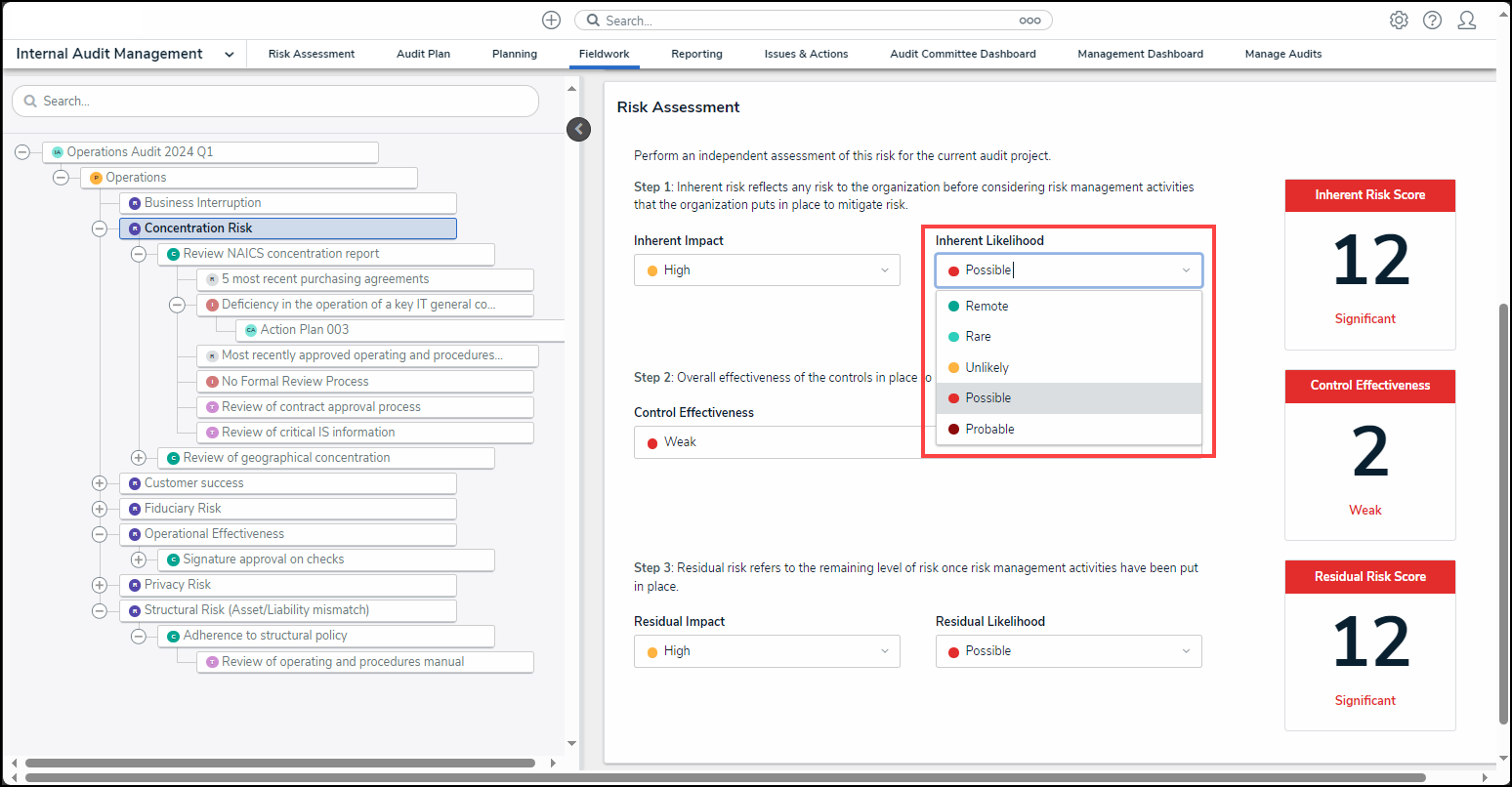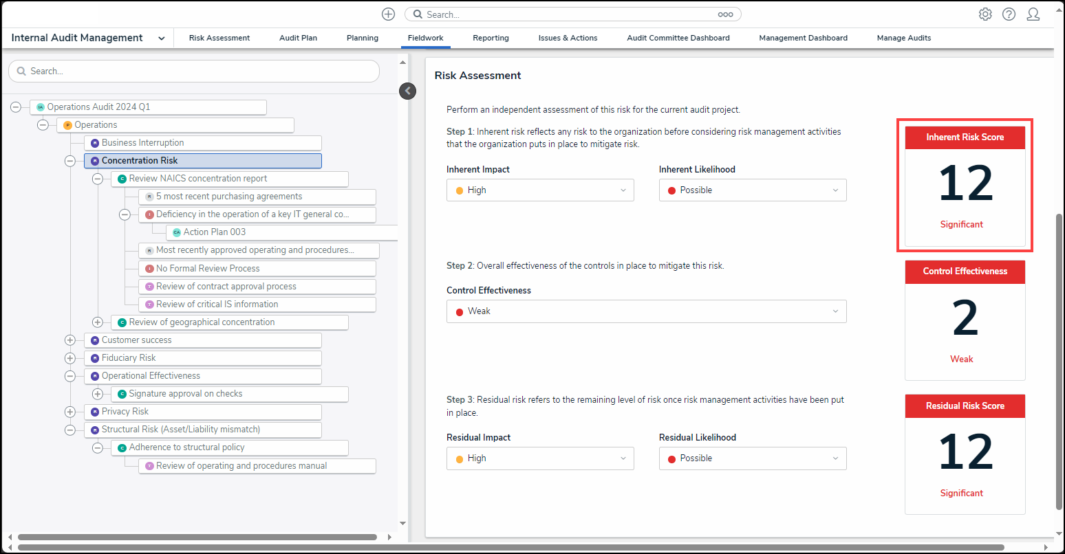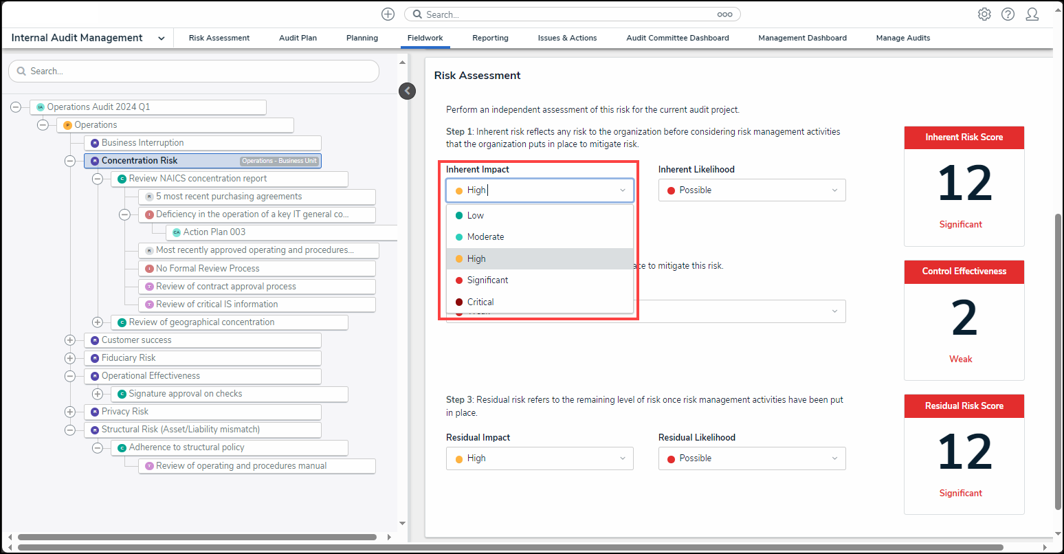 - From the Risk Assessment section, users can perform an independent risk assessment for the internal audit project.