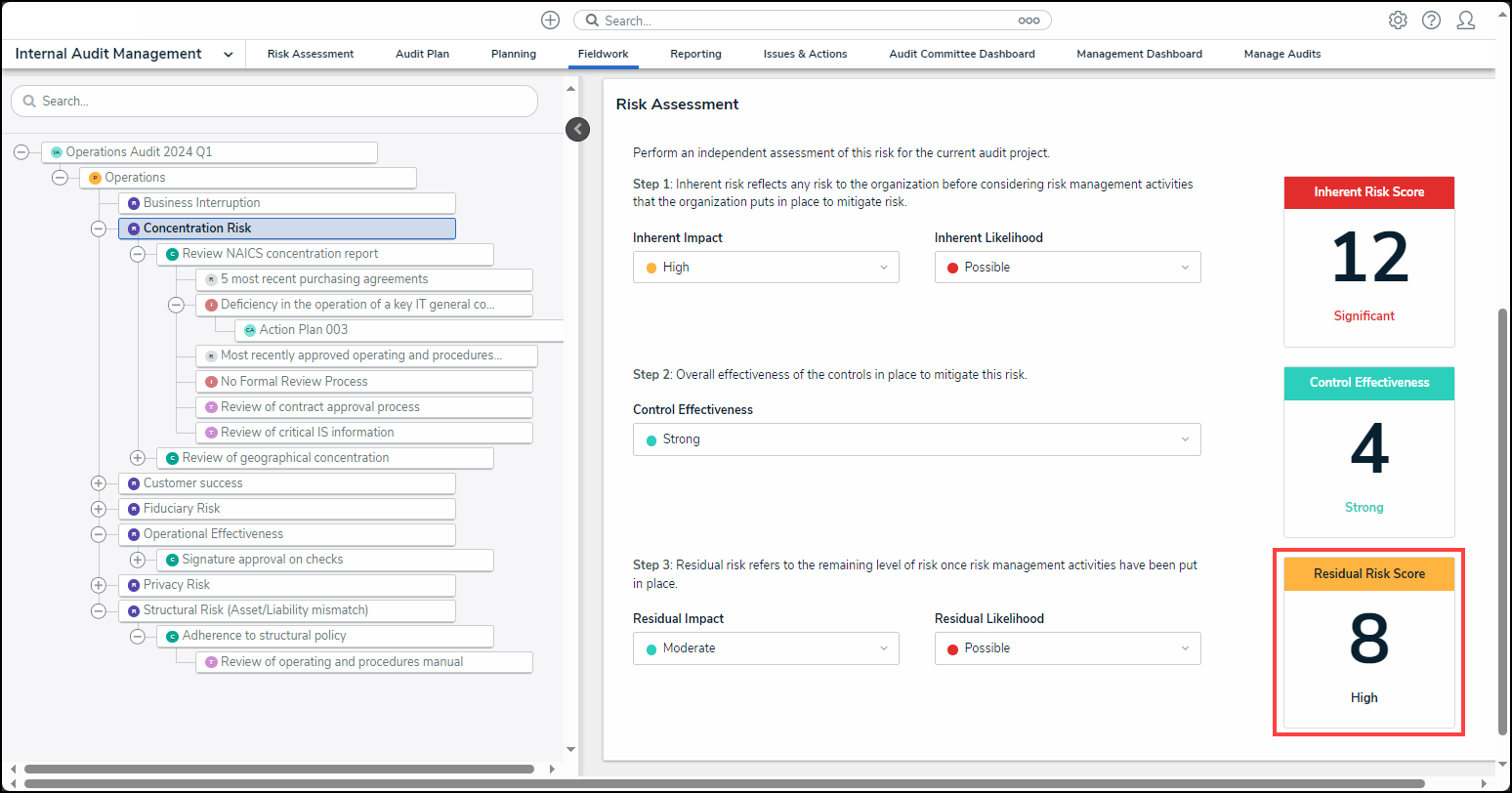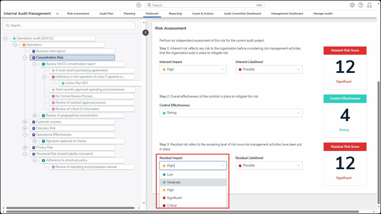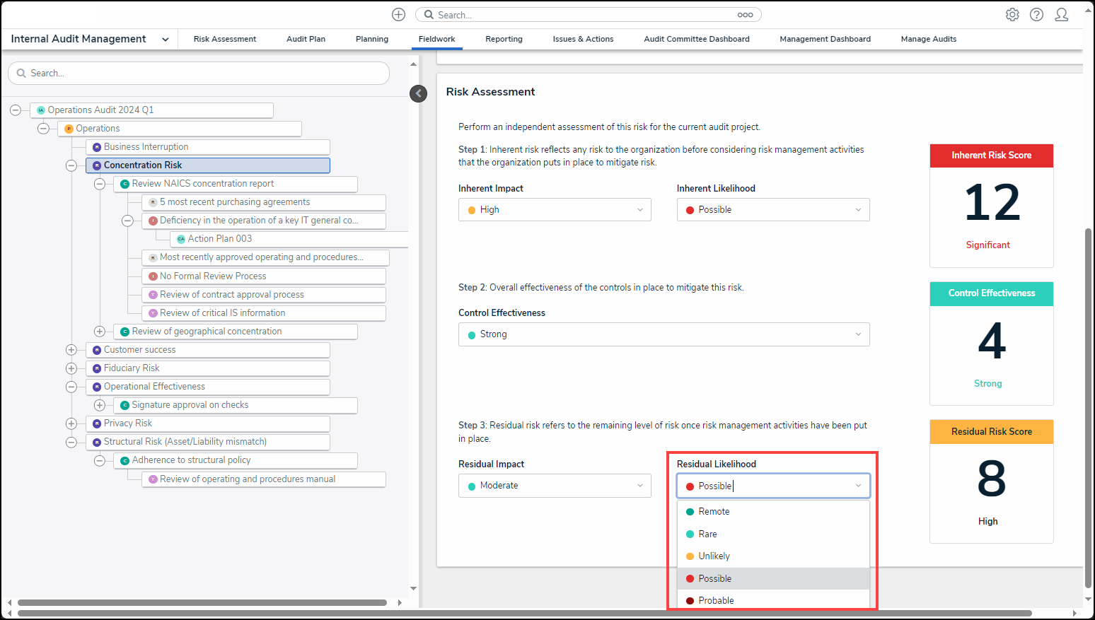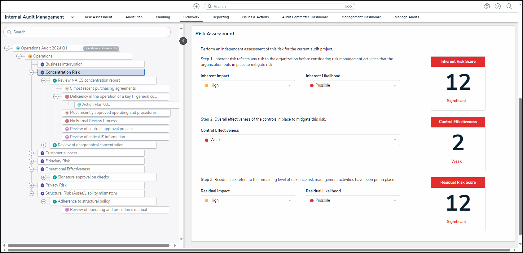 - From the Risk Assessment section, users can perform an independent risk assessment for the internal audit project.