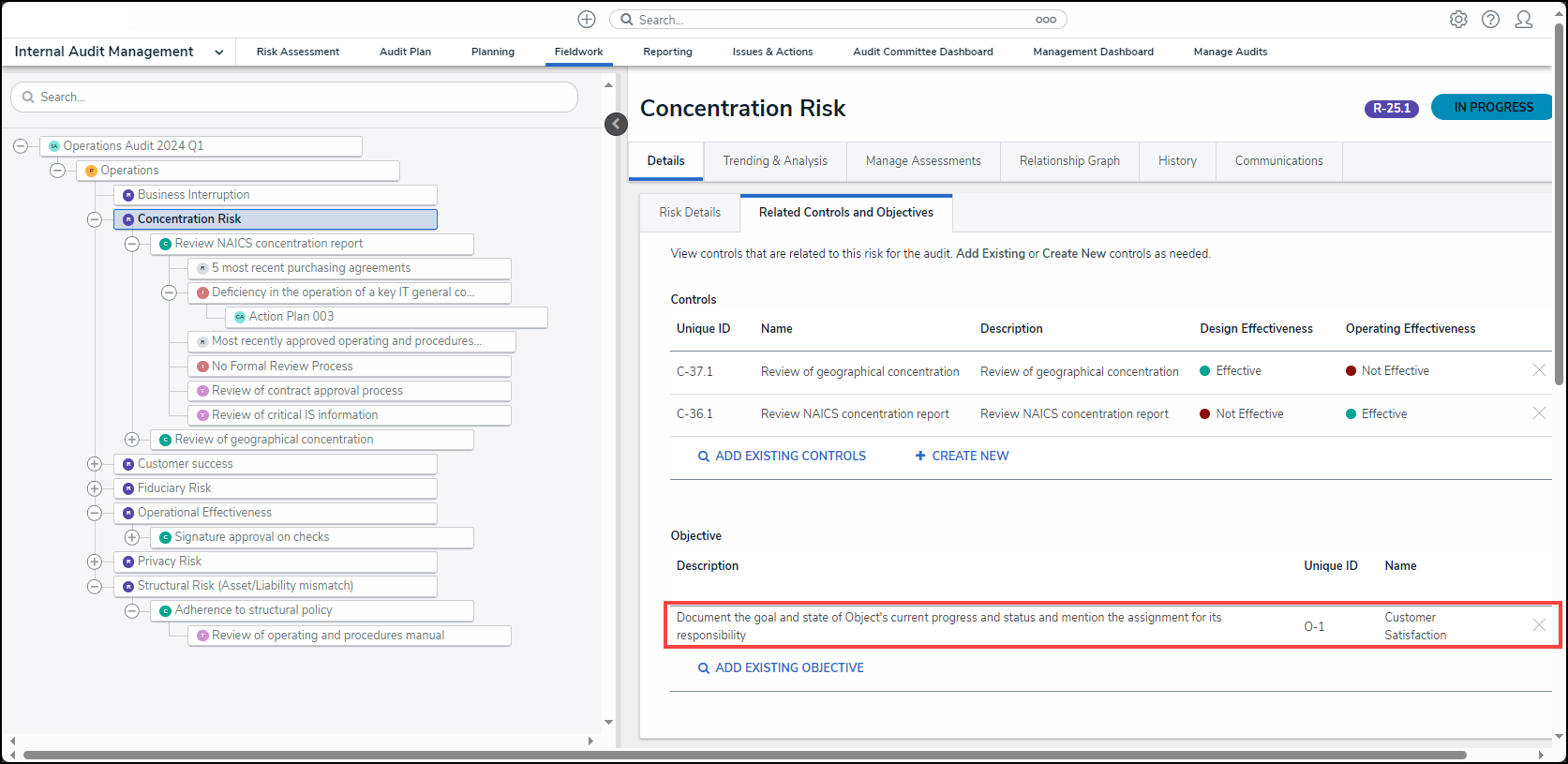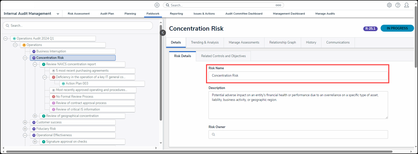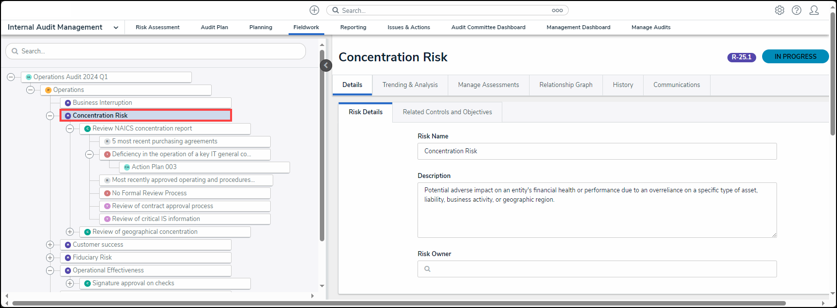 - From the Fieldwork screen, click on the Internal Audit report name that contains the risk you want to review from the Audits in Progress section.