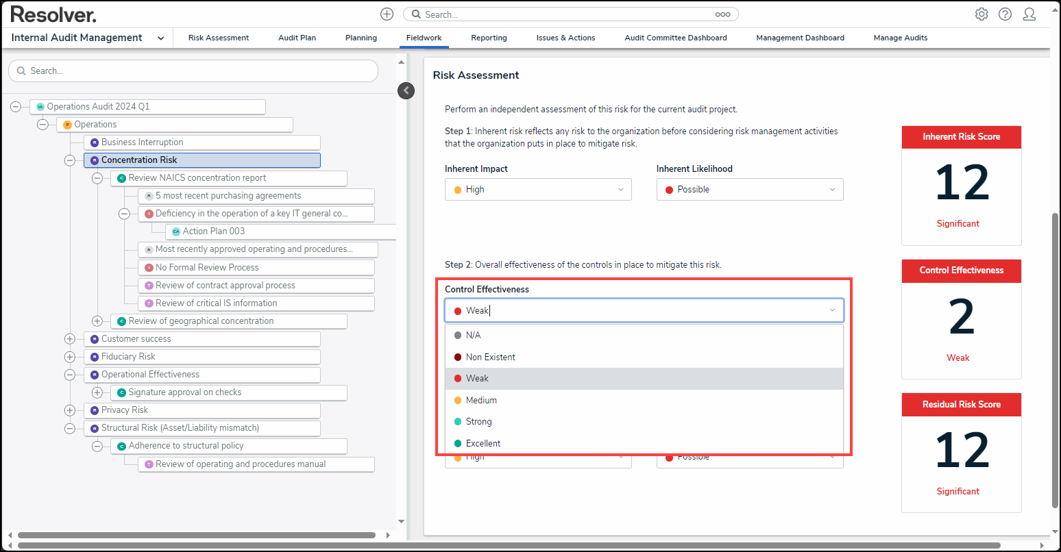 - Select a control effectiveness score from the Control Effectiveness dropdown menu. The control effectiveness score is weighted and will affect the Control Effectiveness Score card. The control effective score represents how effective the control is at preventing the risk from reoccurring.