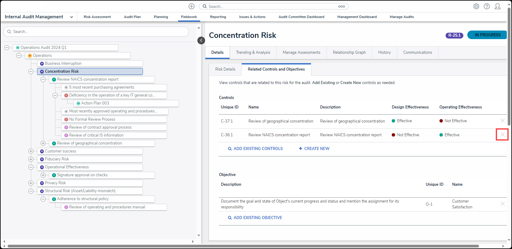 - Click the X icon next to a control or an object to delete a control or an object from the risk.