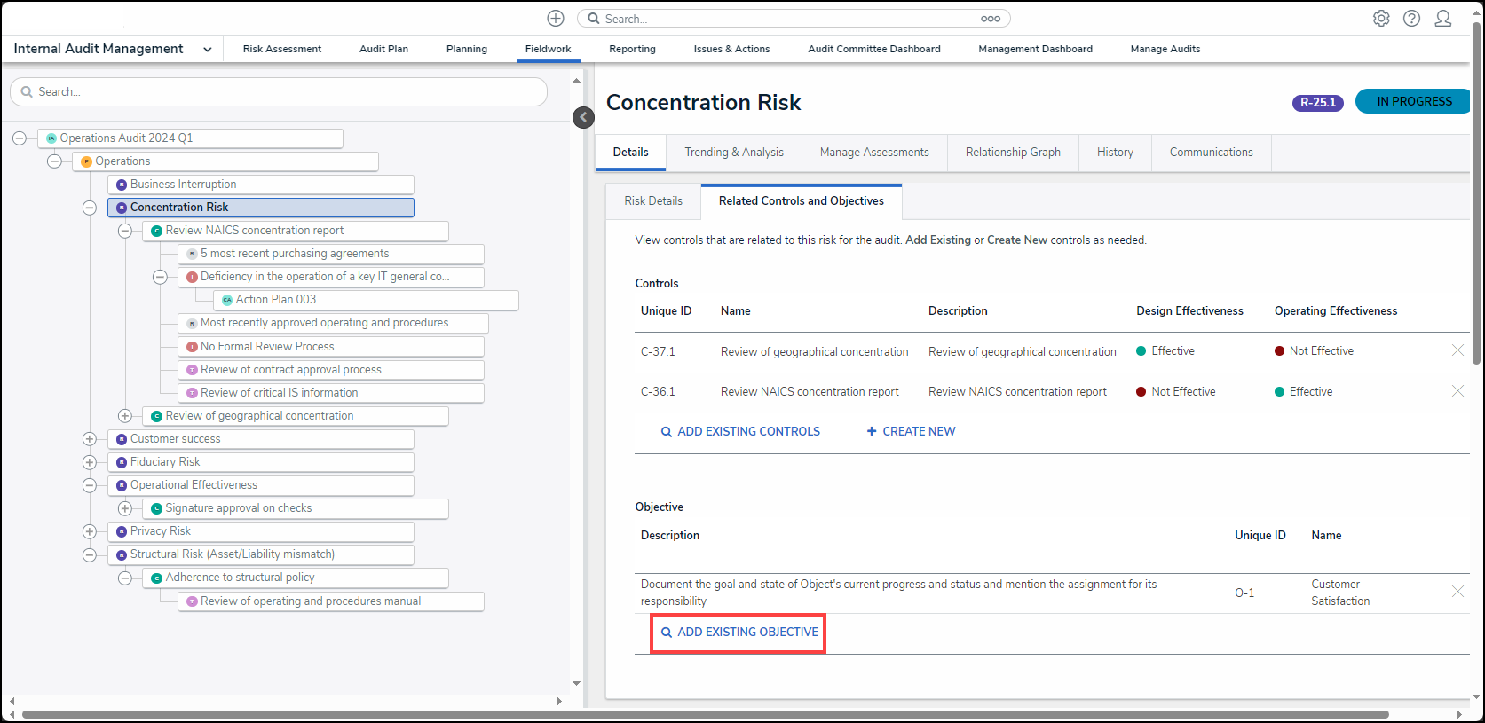 - Click the Add Existing Objective link to add an existing objective to the risk.