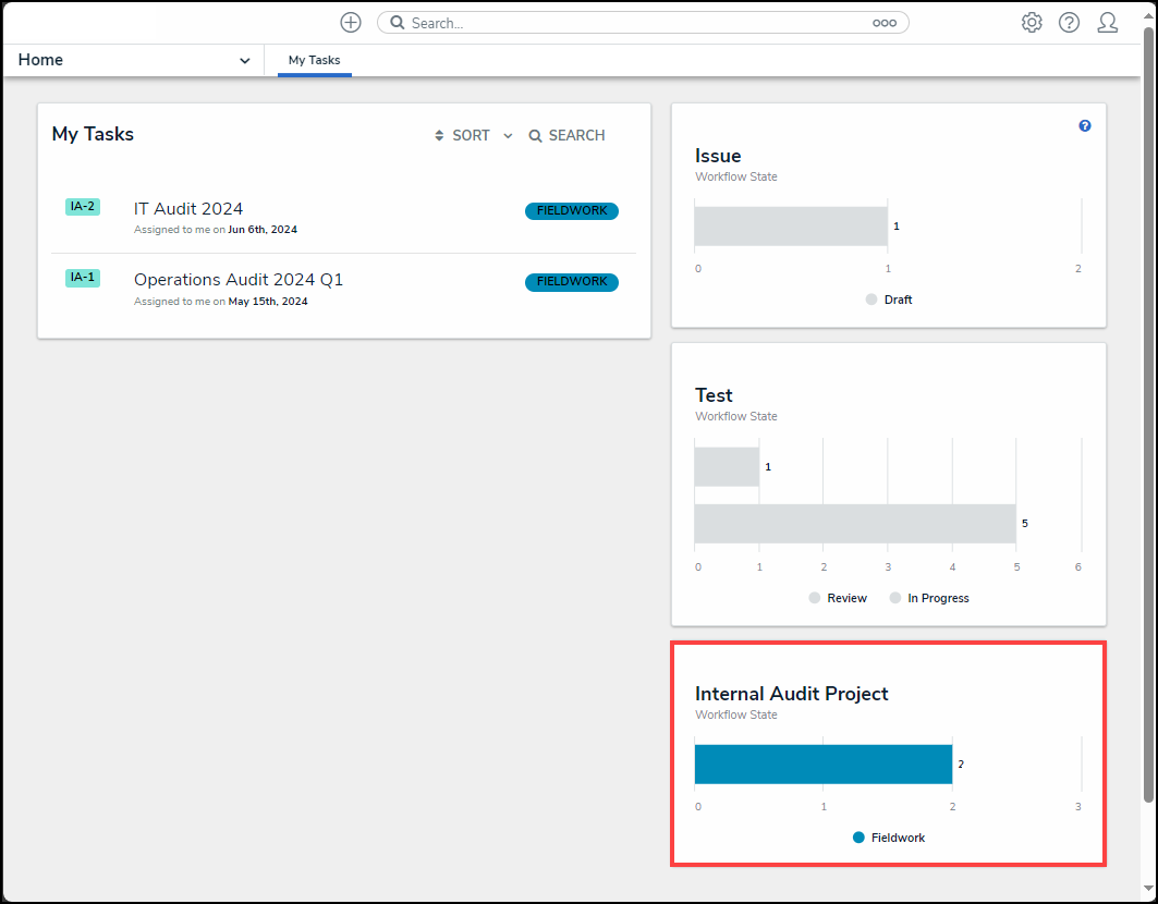 - From the Home screen, click an internal audit project in the fieldwork stage from the My Tasks section.