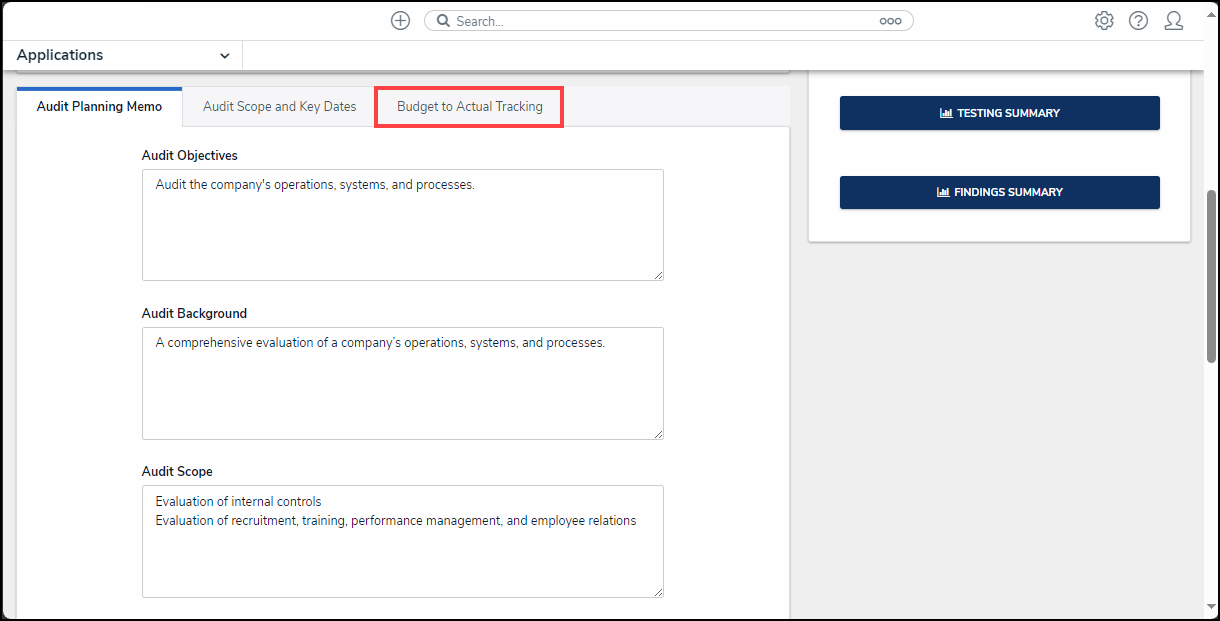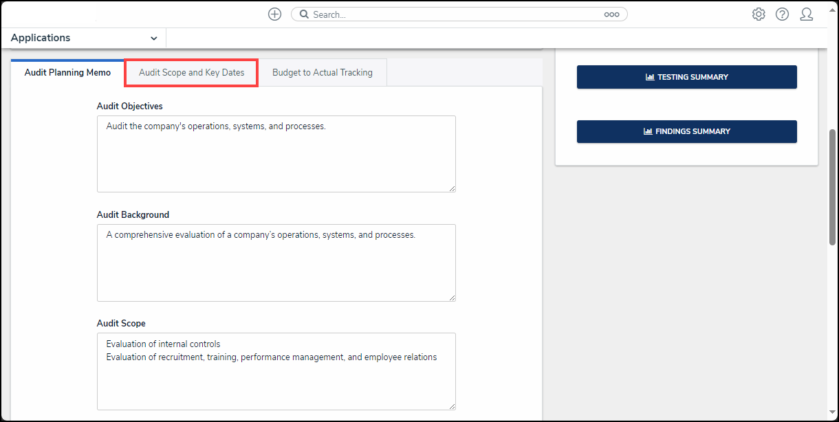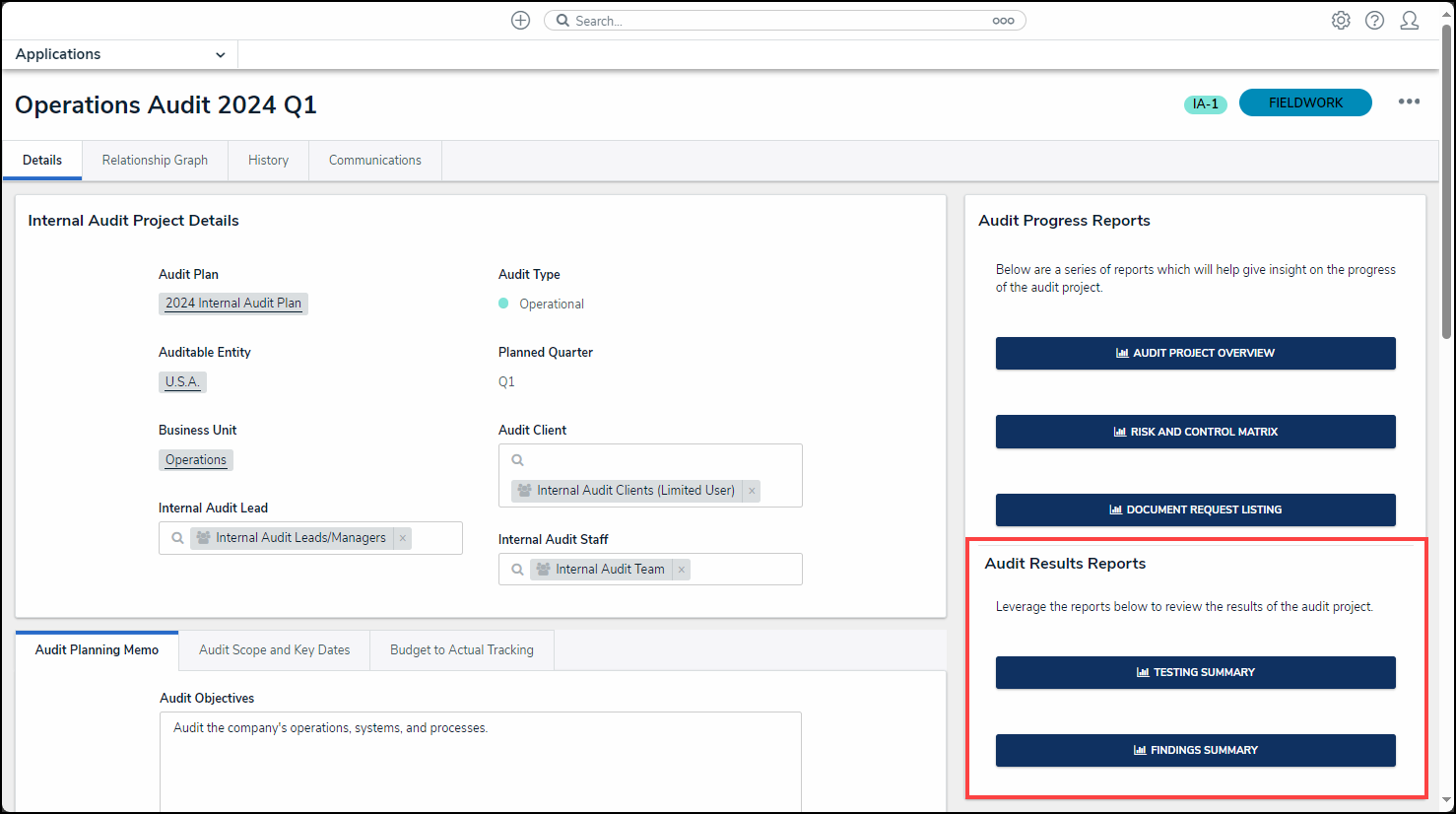 - Testing Summary: View a summary of the test result on the internal audit project.