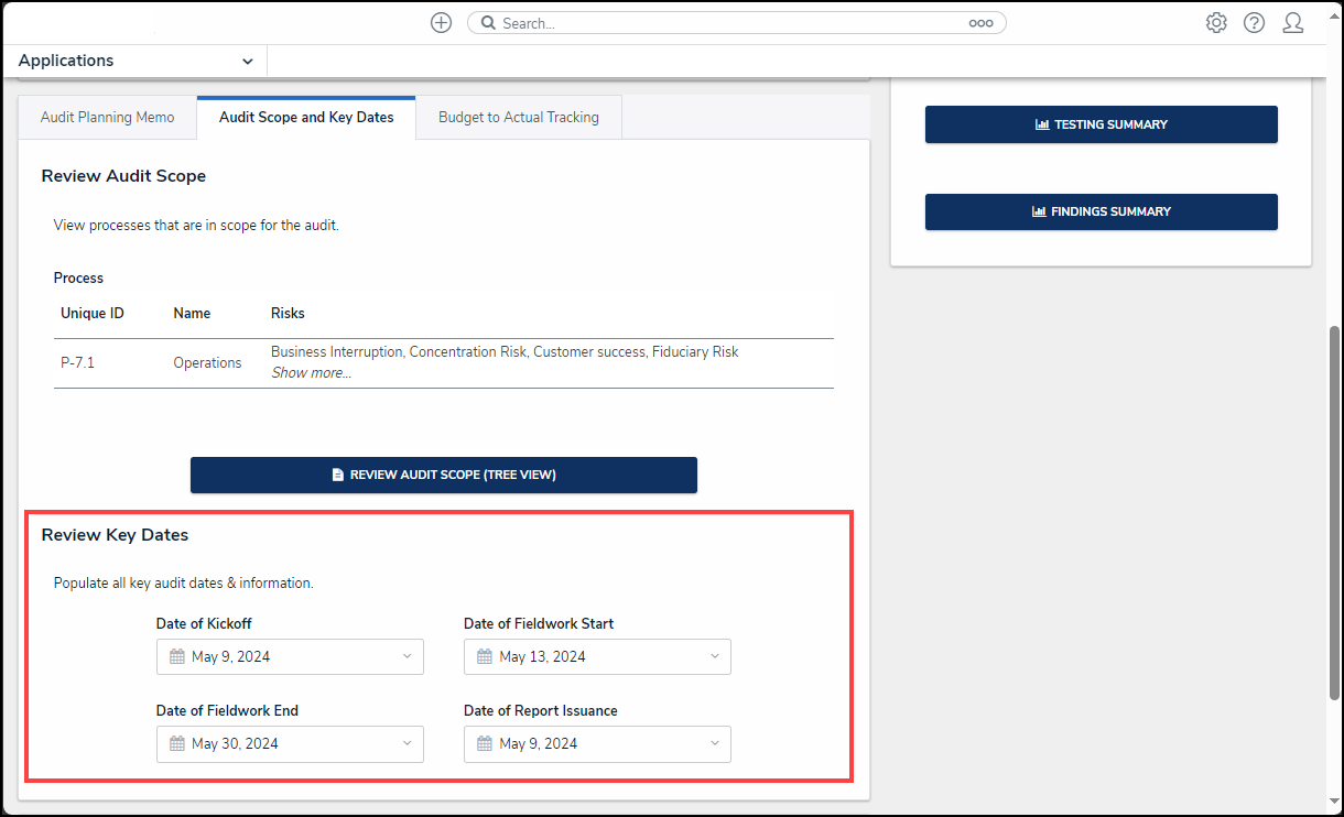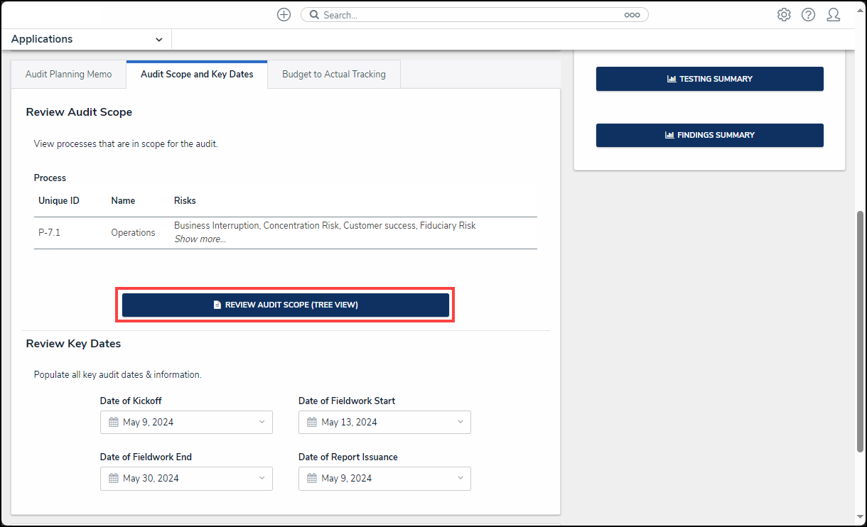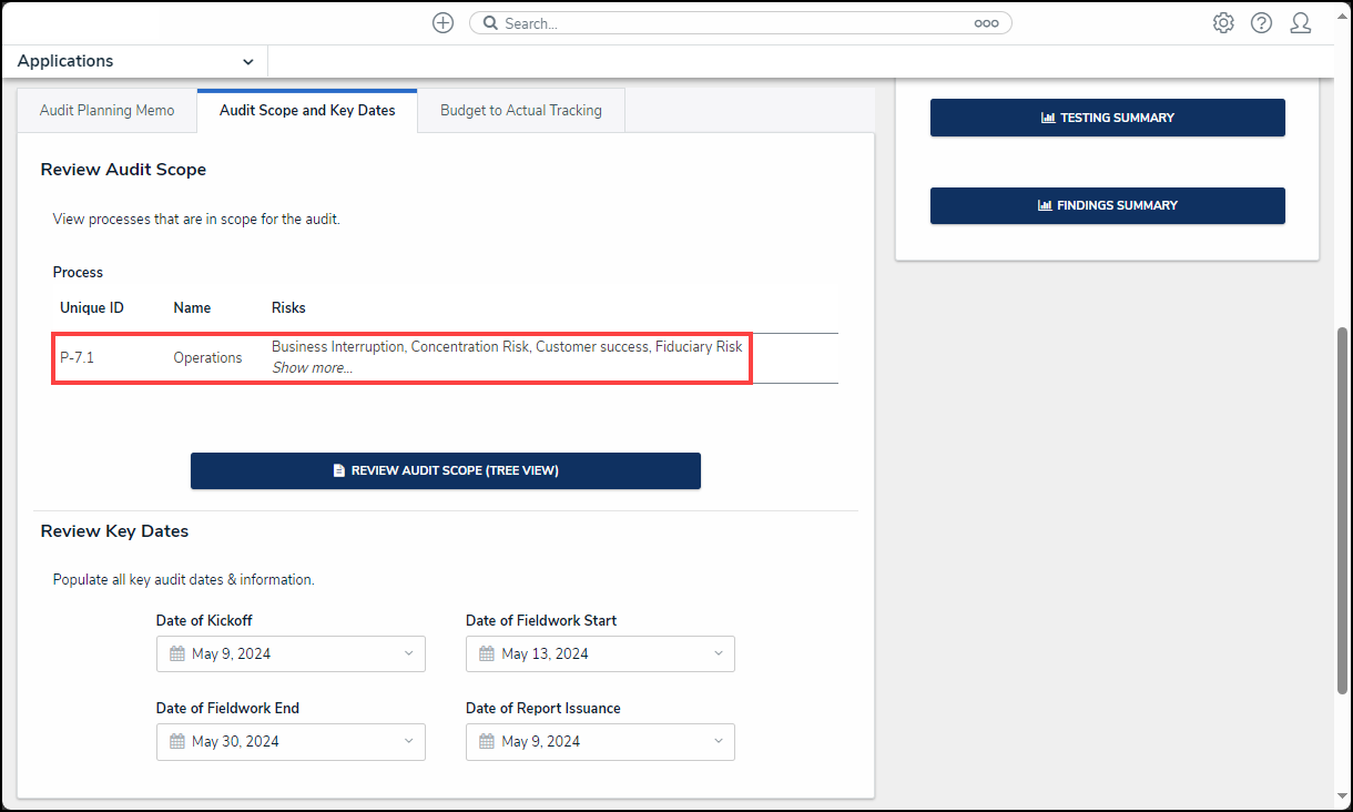 - From the Audit Scope and Key Dates tab, review the process by clicking the process on the Process table.